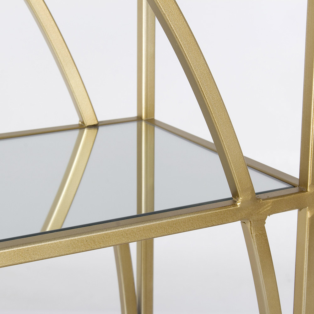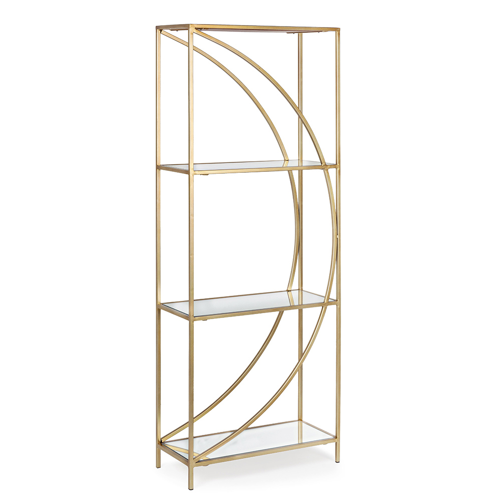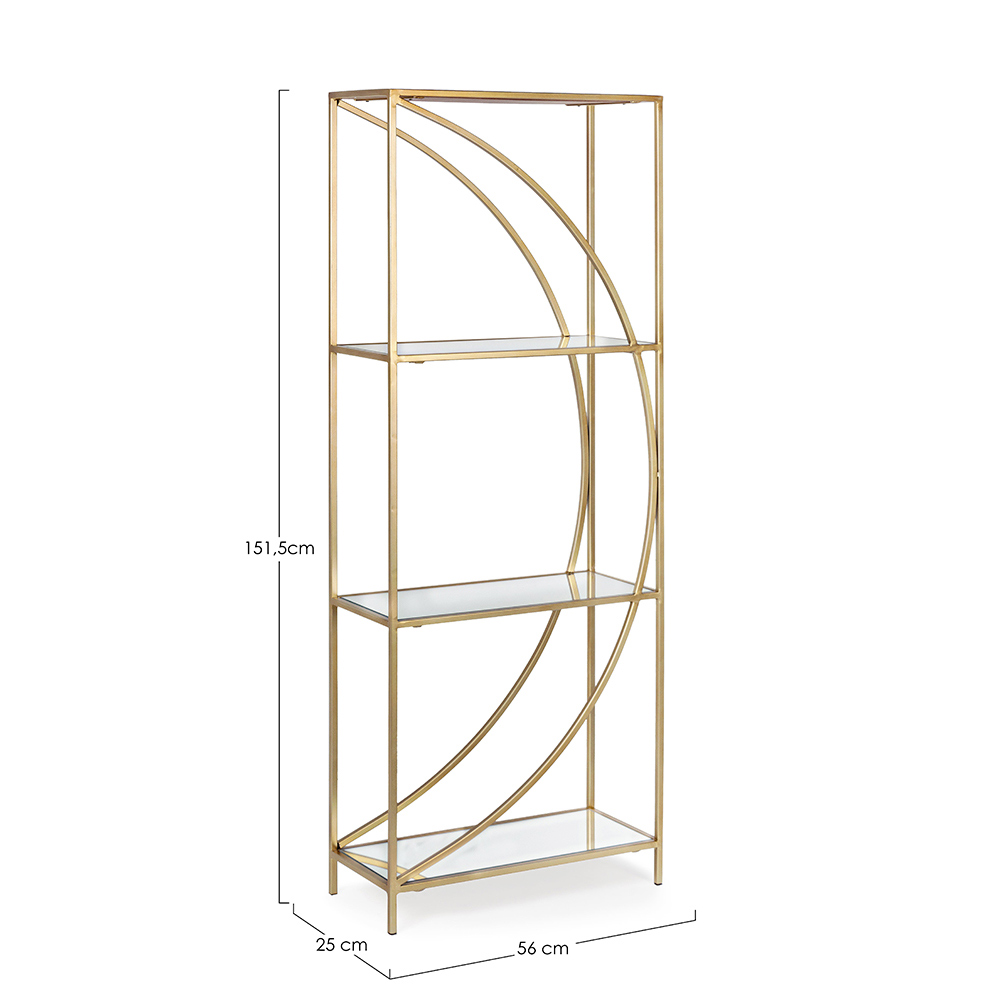 Ten wolnostojący regał posiada stalową konstrukcję malowaną proszkowo farbą epoksydową i szklane półki .