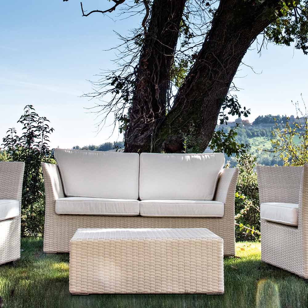 Rama z polirattanu dodaje odrobinę odporności i trwałości na działanie żywiołów, zachowując swoje piękno przez długi czas. Pasujący stolik kawowy jest idealnym uzupełnieniem do serwowania napojów i przekąsek, dzięki czemu jest idealnym zestawem dla gości i na wieczory na świeżym powietrzu.