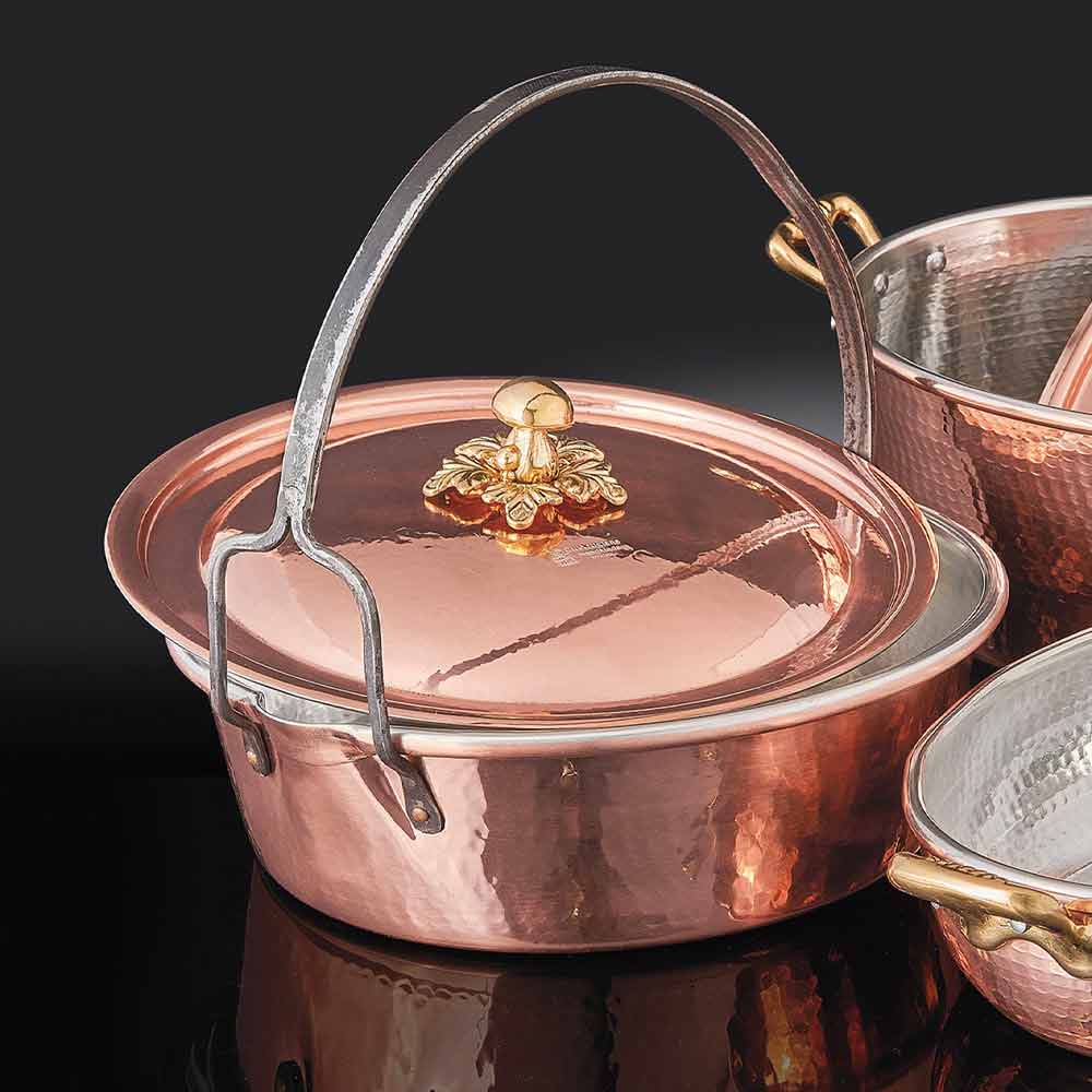 Ręcznie kuty garnek z litej miedzi z pokrywką i praktycznym łukowym uchwytem jest idealny do gotowania risotto, królika w stylu Ischia, kurczaka, duszonych mięs i ogólnie nadaje się do powolnego gotowania.