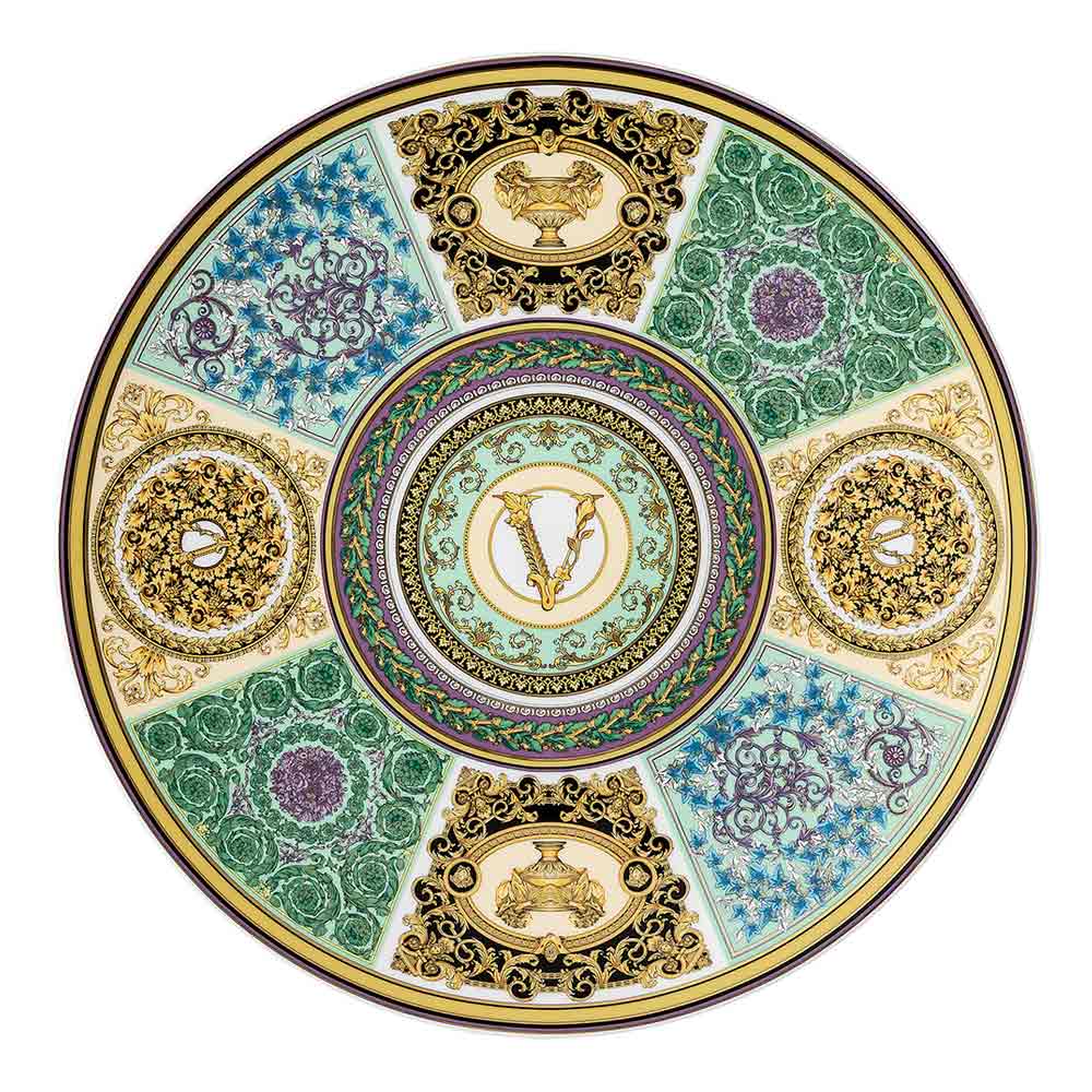 Podkładka Barocco Mosaic marki Versace , wykonana z delikatnej porcelany , jest prawdziwym arcydziełem włoskiej sztuki i designu . Ten wyjątkowy przedmiot mistrzowsko łączy serię kultowych motywów z domu mody, w tym legendarną Meduzę , barokowe ornamenty i misterne mozaiki w jasnych kolorach. Jej wyrafinowana estetyka i złote detale tworzą efekt absolutnego przepychu i wyrafinowania .