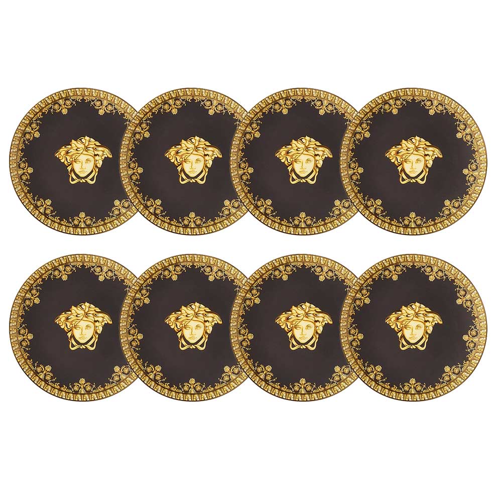 Talerz I Love Baroque marki Versace , wykonany z delikatnej porcelany , jest kwintesencją wyrafinowania i ponadczasowego luksusu . Wyrafinowany projekt charakteryzuje się głębokim czarnym tłem, wzbogaconym o obramowanie zdobione złotymi motywami barokowymi, które ucieleśniają artystyczną tradycję domu. W centrum dominuje ikoniczna twarz Meduzy , symbol potęgi i wiecznego uroku, nadając temu arcydziełu królewski i charakterystyczny charakter.