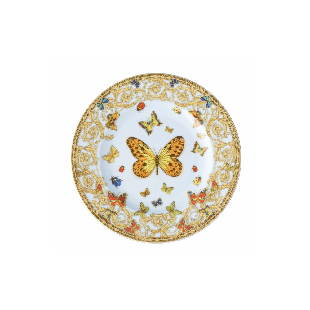Ten uroczy porcelanowy talerz ma jasny i kolorowy wzór, który od razu przyciąga wzrok, dzięki czemu jest zarówno przedmiotem kolekcjonerskim, jak i wyrafinowaną zastawą stołową. Elegancki motyl wyróżnia się na środku, otoczony delikatną ozdobną obwódką z motywami kwiatowymi i arabeskowymi.