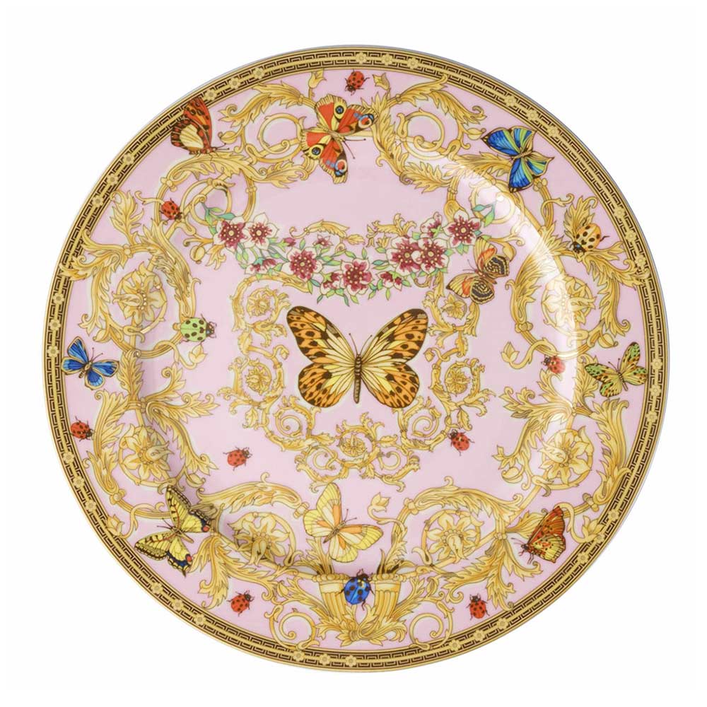 Ten wspaniały porcelanowy talerz celebruje piękno natury dzięki bogatemu wzornictwu kolorowych motyli i misternych motywów kwiatowych, umieszczonych na zachwycającym różowym tle. Każdy szczegół jest pieczołowicie wykonany, od żywych motyli, które wydają się wzbijać w powietrze z talerza, po delikatne kwiaty i złote ozdoby, które oprawiają i zdobią projekt.