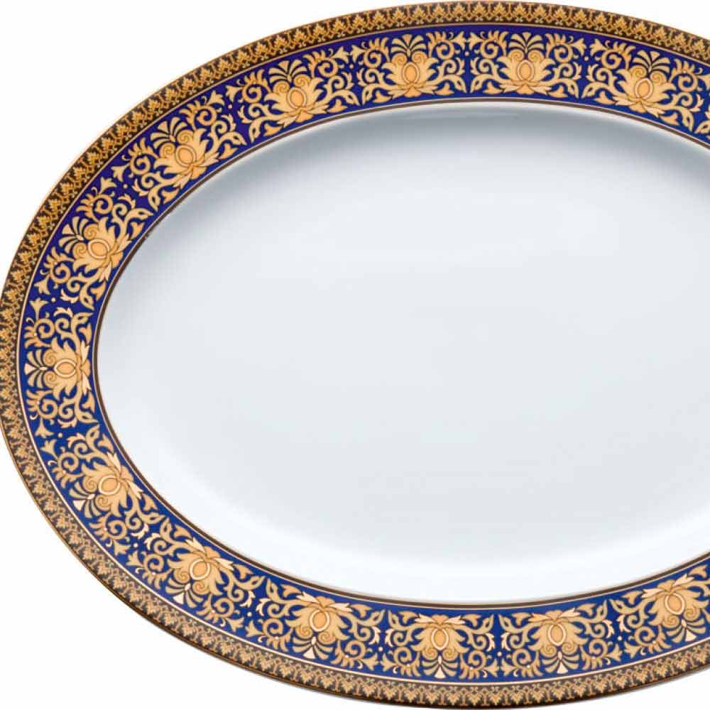 Fantastyczny i nowoczesny owalny talerz o wymiarach 34 x 24,5 cm zaprojektowany przez Versace jest częścią eleganckiej, nowoczesnej kolekcji, która w połączeniu z fascynującym i wyrafinowanym glamourem nawiązuje do minionych epok i jest wyrażona w jasnym odcieniu niebieskiego, nazwanym Medusa Blue.