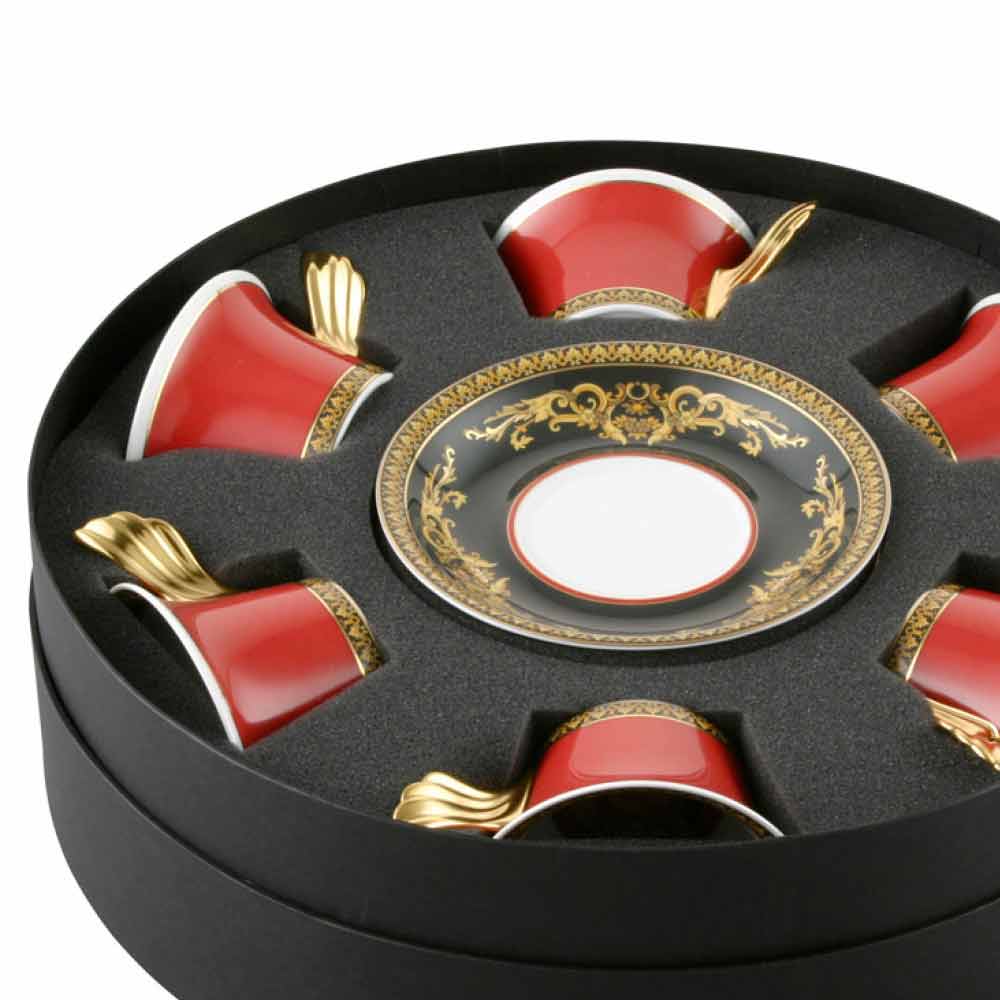 Zestaw sześciu filiżanek jest częścią linii Medusa Rosso , charakteryzującej się trzema dominującymi odcieniami kolorystycznymi: elegancką czerwienią oraz wysoko cenionymi połączeniami złota i czerni; w połączeniu tworzą one wyrafinowany motyw, który przeniesie Cię do fascynujących i odległych epok.