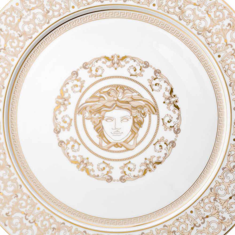Najważniejszym elementem tej kolekcji jest wspaniała złota głowa Meduzy, niezaprzeczalny znak firmowy Versace, otoczona ekspresyjnymi barokowymi dekoracjami. Głowa Meduzy jest obecna – w centrum – na wszystkich filiżankach i dzbankach, a także na wszystkich dużych i małych talerzach kolekcji „Medusa”. Prawdziwe arystokratyczne kolory – jaskrawoczerwony, elegancki złoty i czarny – oraz misterne wzory i ozdoby filigranowe nadają głowie Meduzy wystawną ramę kolorystyczną o niespotykanej elegancji. Kolekcja „Medusa” obejmuje kompletny serwis stołowy i serwis do kawy, a także liczne akcesoria. Duże filiżanki śniadaniowe do cappuccino i latte, talerze do zupy i miski są częścią kolekcji, podobnie jak cenne i bardzo osobiste akcesoria upominkowe, takie jak pierścień na serwetki, świecznik, wazony i elegancki zestaw do palenia. Dwie kolekcje szkła „ Medusa Lumière” i „Méandre”, a także kolekcja sztućców „Medusa Gold” dopełniają elegancki, kolorowy stół w niepowtarzalnym stylu świata Versace.