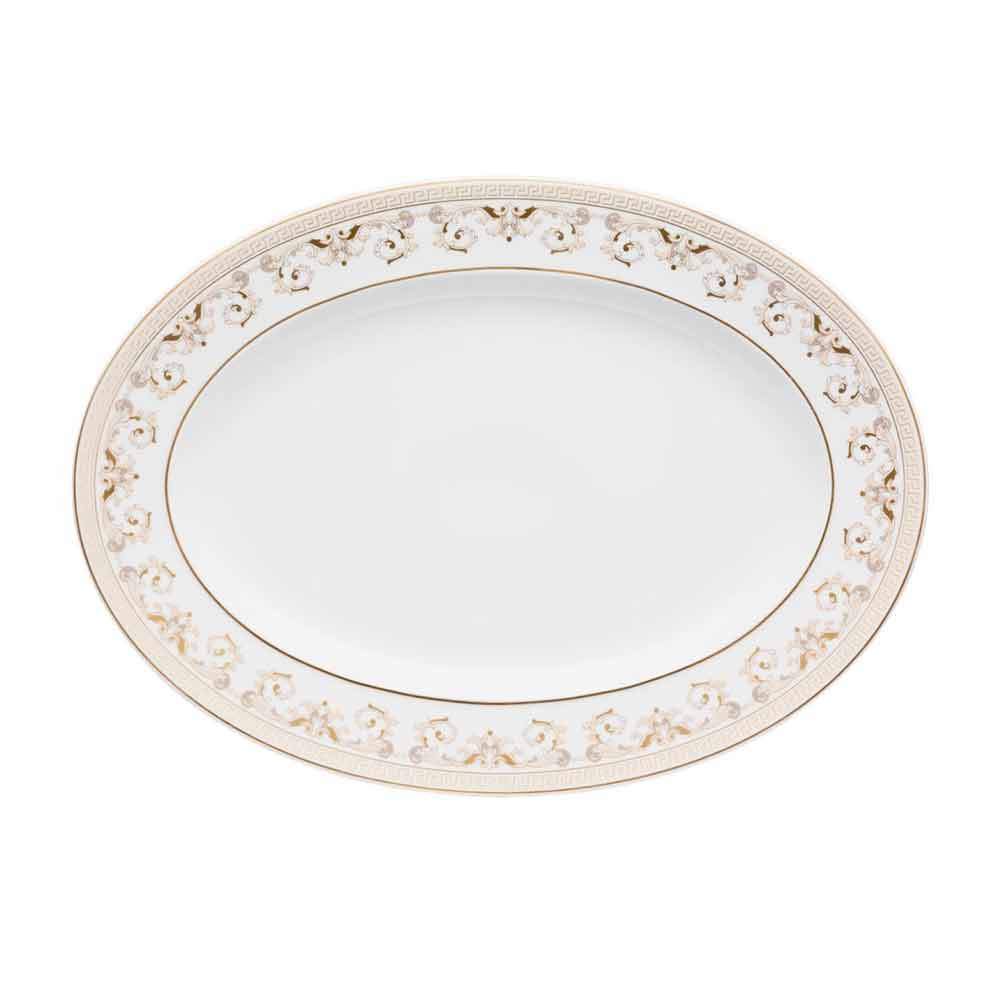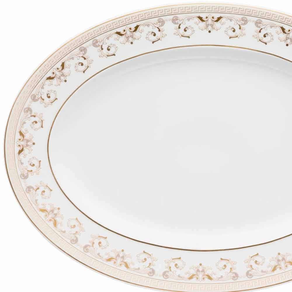 Owalny talerz o wymiarach 34x24,5 cm marki Versace jest częścią wyrafinowanej i luksusowej kolekcji stolików Medusa Gala.
