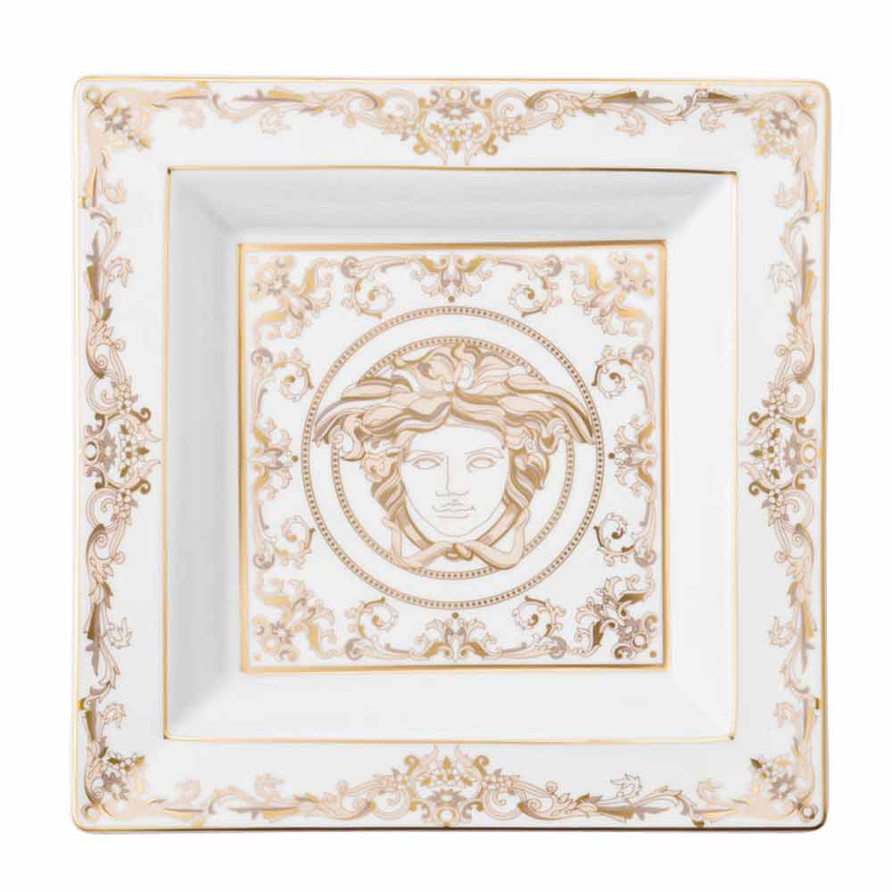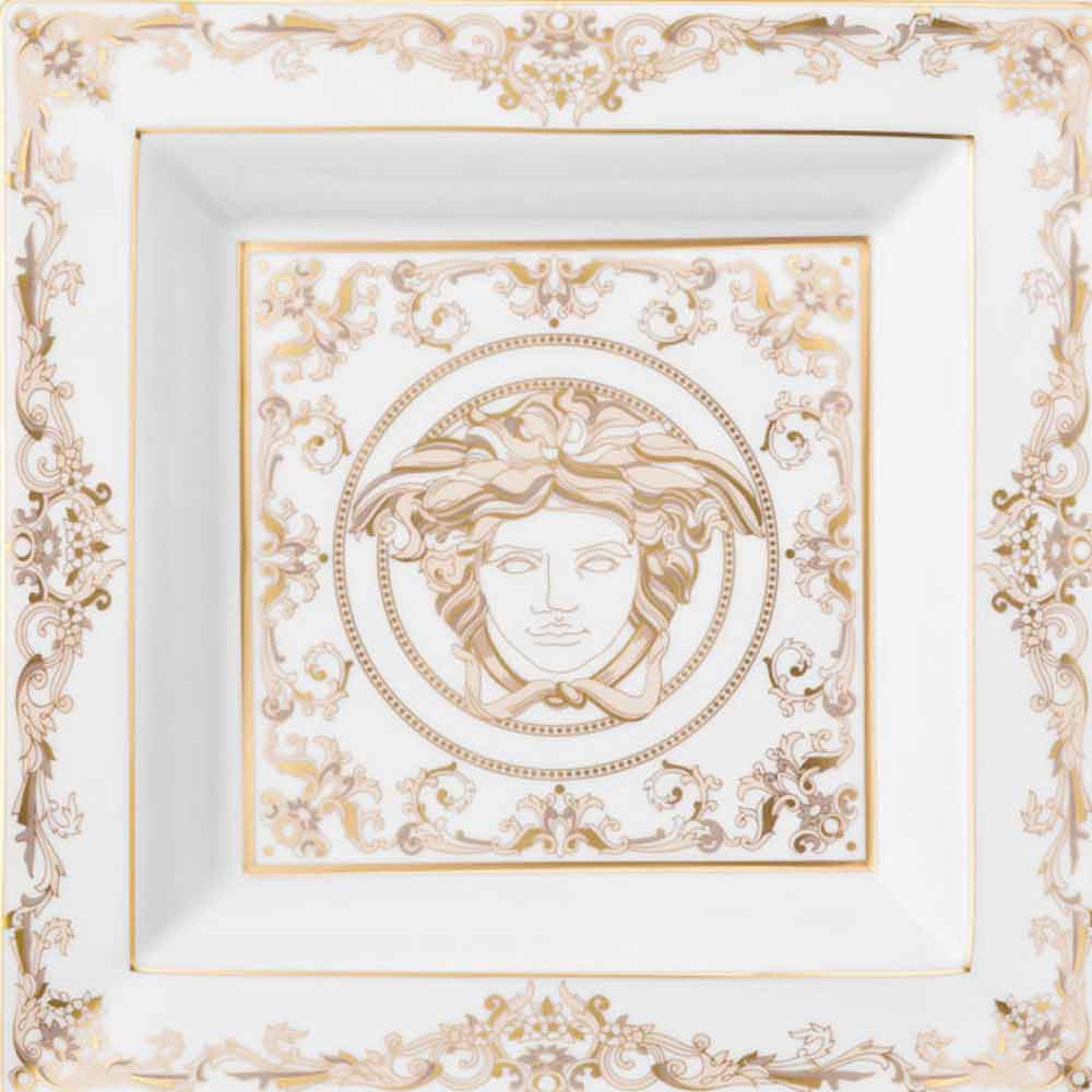 Najważniejszym elementem tej kolekcji jest wspaniała złota głowa Meduzy, niezaprzeczalny znak firmowy Versace, otoczona ekspresyjnymi barokowymi dekoracjami. Głowa Meduzy jest obecna – w centrum – na wszystkich filiżankach i dzbankach, a także na wszystkich dużych i małych talerzach kolekcji „Medusa”. Prawdziwe arystokratyczne kolory – jaskrawoczerwony, elegancki złoty i czarny – oraz misterne wzory i ozdoby filigranowe nadają głowie Meduzy wystawną ramę kolorystyczną o niespotykanej elegancji. Kolekcja „Medusa” obejmuje kompletny serwis stołowy i serwis do kawy, a także liczne akcesoria. Duże filiżanki śniadaniowe do cappuccino i latte, talerze do zupy i miski są częścią kolekcji, podobnie jak cenne i bardzo osobiste akcesoria upominkowe, takie jak pierścień na serwetki, świecznik, wazony i elegancki zestaw do palenia. Dwie kolekcje szkła „ Medusa Lumière” i „Méandre”, a także kolekcja sztućców „Medusa Gold” dopełniają elegancki, kolorowy stół w niepowtarzalnym stylu świata Versace.