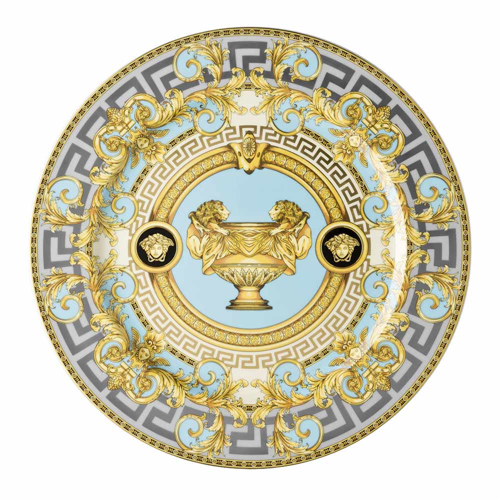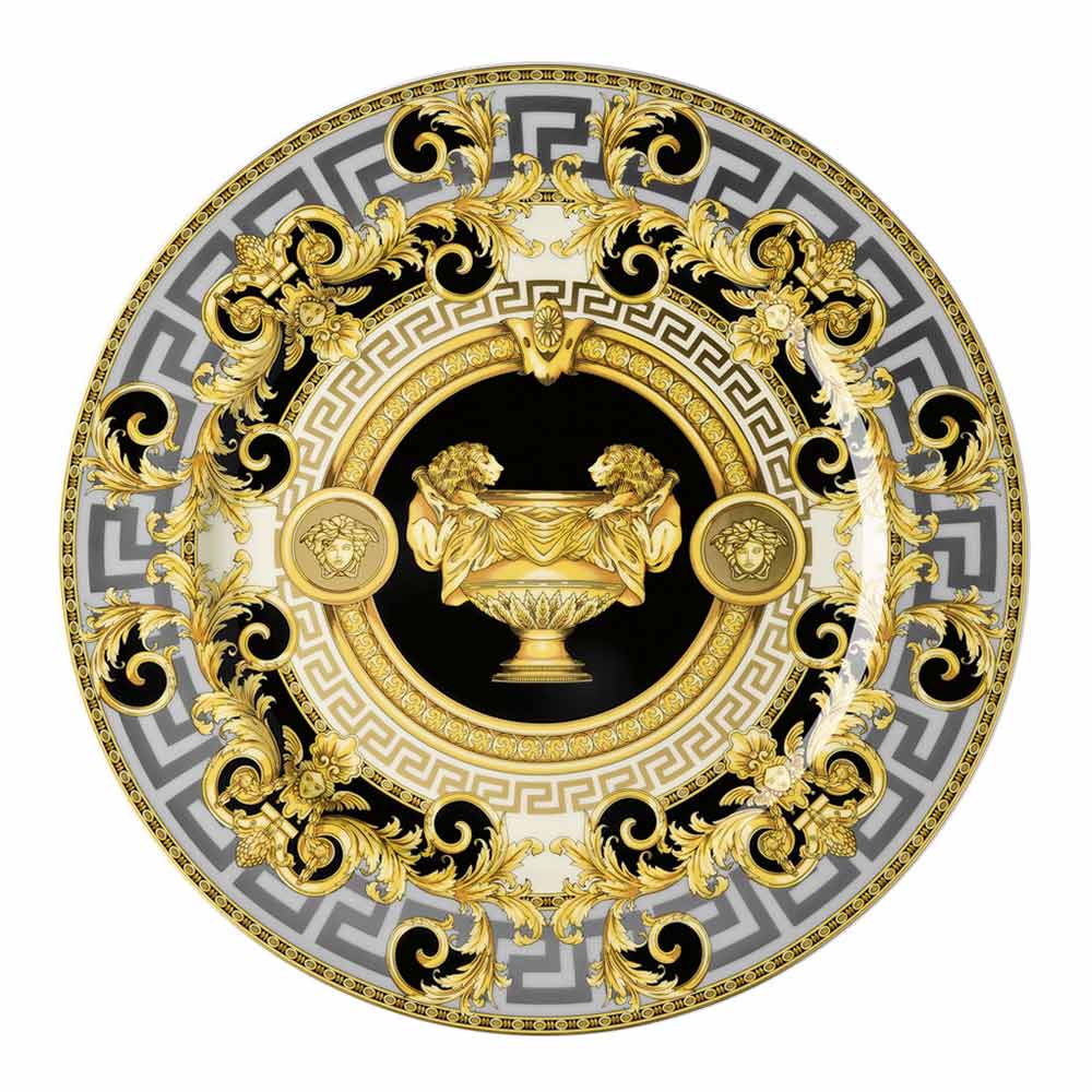Talerz na winietki Prestige Gala marki Versace , wykonany z wyrafinowanej porcelany , jest autentycznym hołdem dla klasycznej elegancji i ponadczasowego luksusu. Nadzwyczajny projekt zdominowany jest przez wspaniałą złotą amforę , symbol królewskości i majestatu, w centrum ramki ozdobionej klasycznym greckim motywem i barokowymi kwiatowymi detalami w kolorze złotym. Dostępny w dwóch wariantach tła, czarnym i jasnoniebieskim, ten talerz oferuje wyrafinowany kontrast, który podnosi każde miejsce.