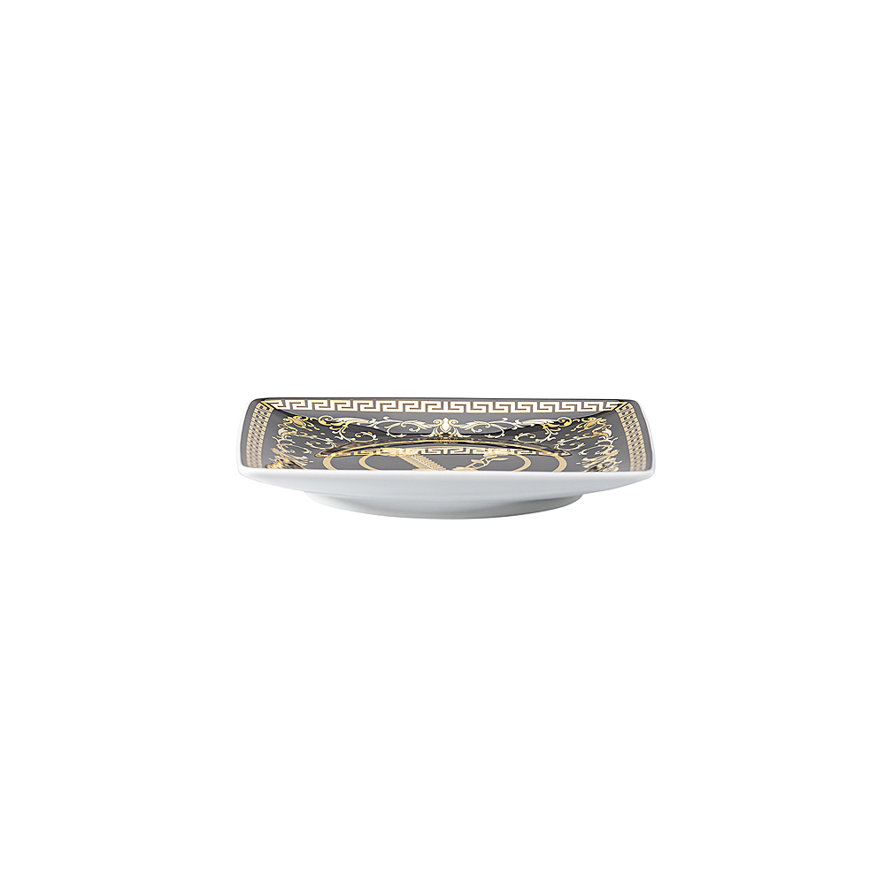 Płaskie kwadratowe filiżanki Virtus Gala od Versace to idealne połączenie wyrafinowanego designu i funkcjonalności. Wykonane z cienkiej porcelany , wyróżniają się eleganckim błyszczącym tłem ozdobionym złotymi detalami w stylu barokowym, w tym kultowym symbolem „V” Versace, symbolem ponadczasowego stylu i luksusu .