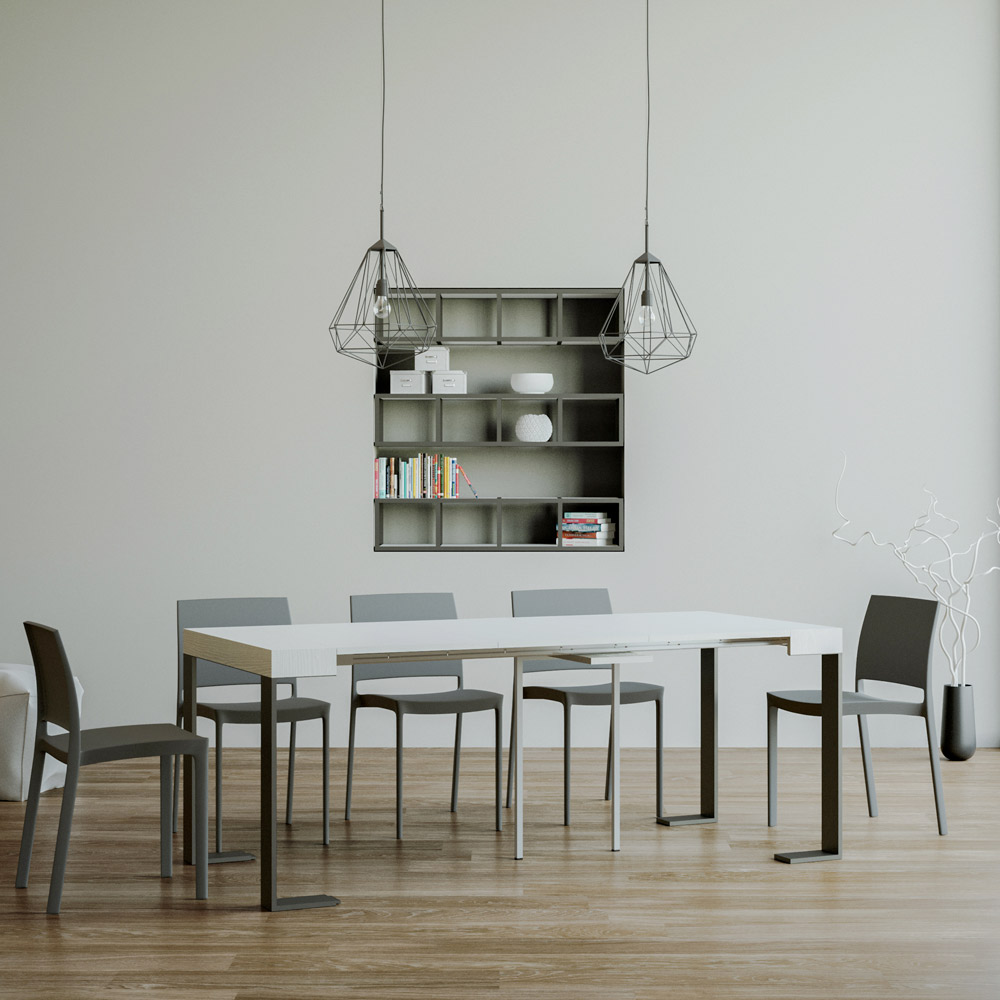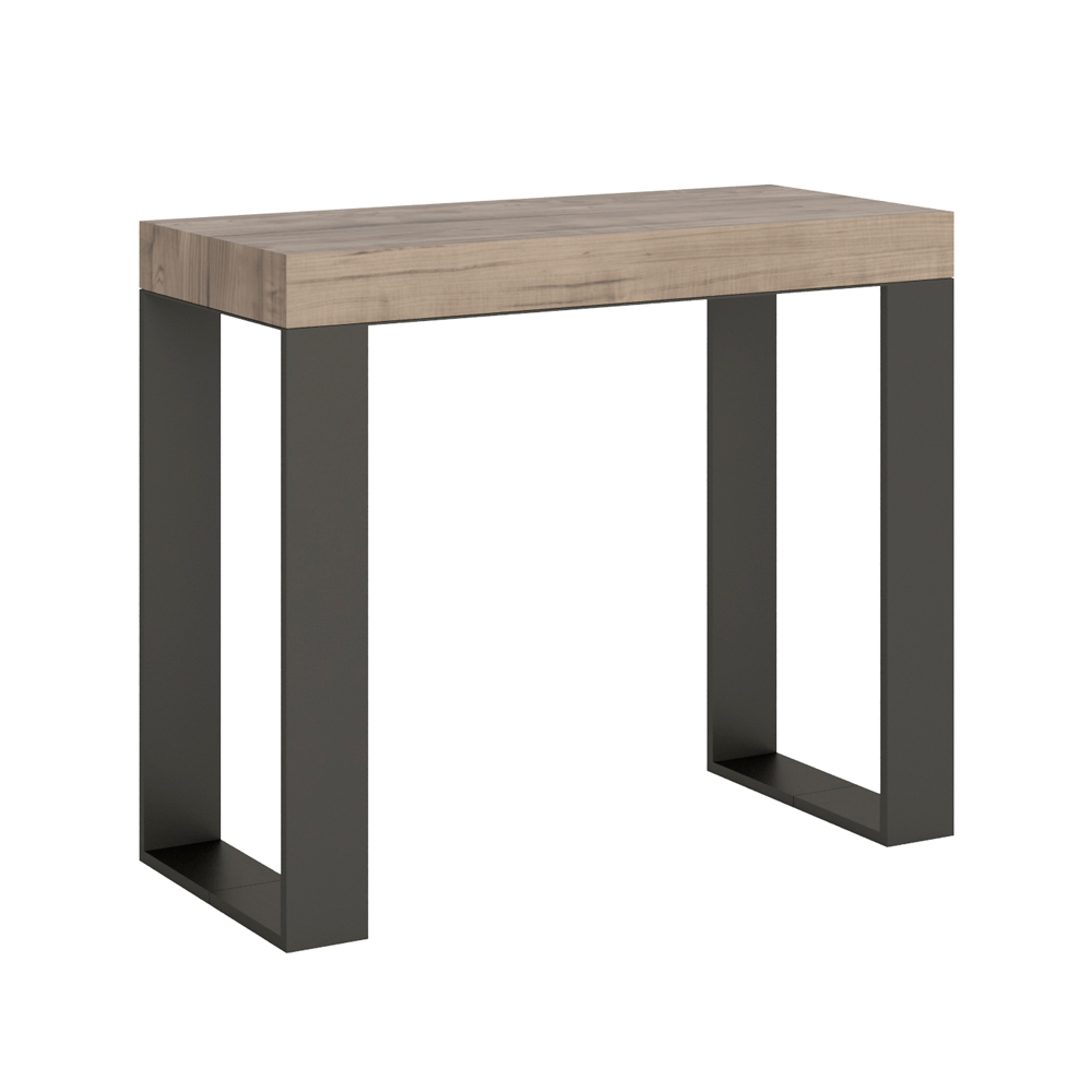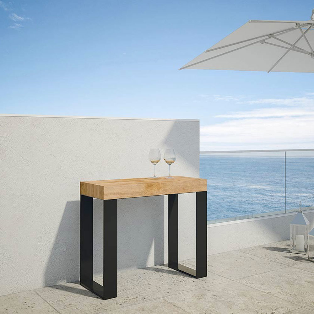 Główną cechą tej konsoli jest możliwość rozłożenia, co pozwala przekształcić ją ze smukłego, dyskretnego mebla w bardziej przestronny i przytulny stolik. Dzięki temu idealnie nadaje się do małych lub wielofunkcyjnych przestrzeni, w których każdy centymetr jest cenny.