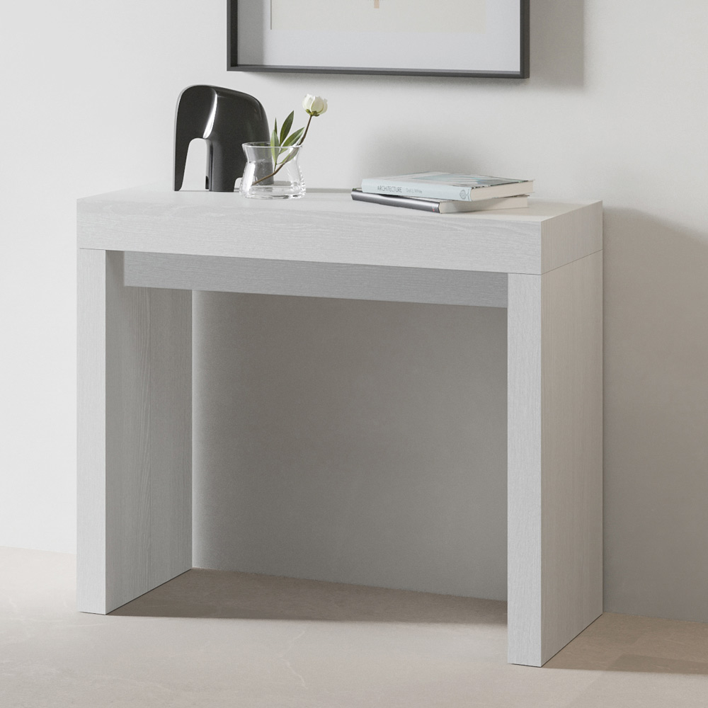 Ten wysuwany stół konsolowy to arcydzieło współczesnego designu i intuicyjnej funkcjonalności. Blat i boki wykonane z drewna oferują jasną i otwartą atmosferę, idealną dla tych, którzy chcą stworzyć przestrzeń, która jest zarówno atrakcyjna, jak i nowoczesna. Jego istotna i czysta estetyka sprawia, że nadaje się do każdego środowiska, idealnie pasując do minimalistycznego projektu lub jako kontrast w bardziej kolorowym i żywym.