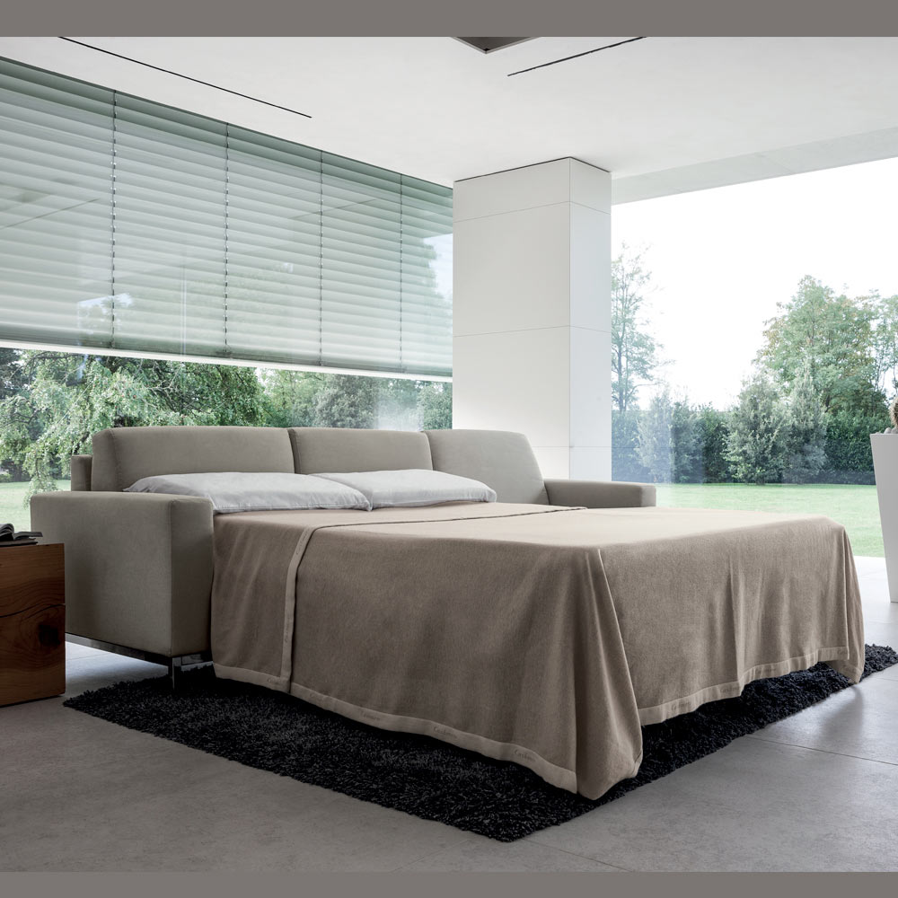 chromowanego metalu. Sofa z funkcją spania to wszechstronny i elegancki mebel, idealny do nowoczesnych przestrzeni. Jej transformowalność pozwala na łatwe przejście z sofy do łóżka, oferując praktyczne rozwiązanie dla gości. Prosty, ale wyrafinowany design z czystymi liniami i wysokiej jakości tapicerką materiałową sprawia, że jest ona estetycznie przyjemna. Miękkie poduszki zapewniają wygodę zarówno jako sofa, jak i łóżko. To harmonia między funkcjonalnością, komfortem i nowoczesnym stylem.