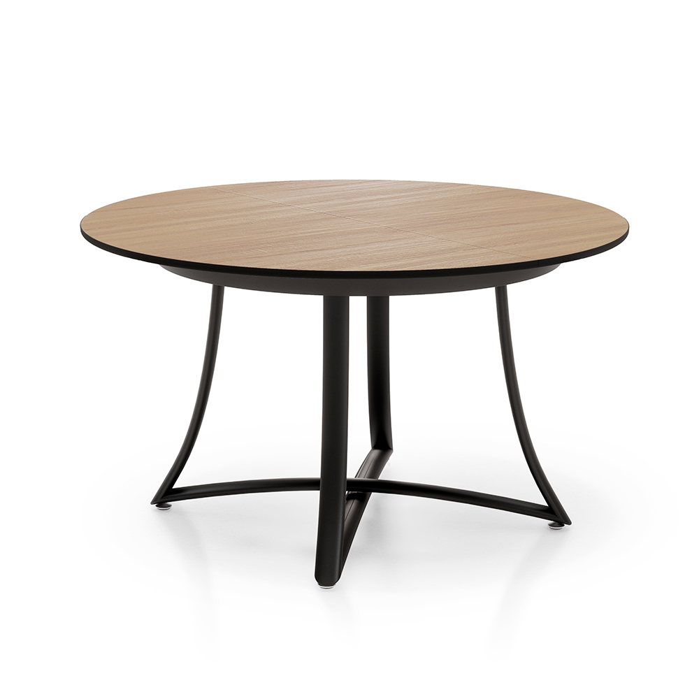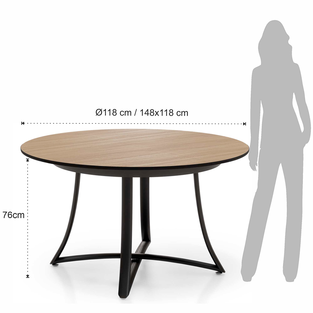 Ten okrągły rozkładany stół jest doskonałym przykładem nowoczesnego designu , który łączy w sobie funkcjonalność i styl. Dzięki drewnianemu blatowi stół ten tworzy ciepłą i przyjazną atmosferę, a czarna metalowa podstawa zapewnia silny kontrast wizualny, który dodaje całości odrobinę współczesnej elegancji .