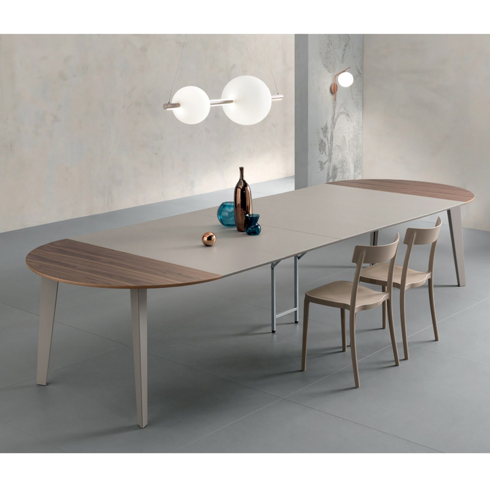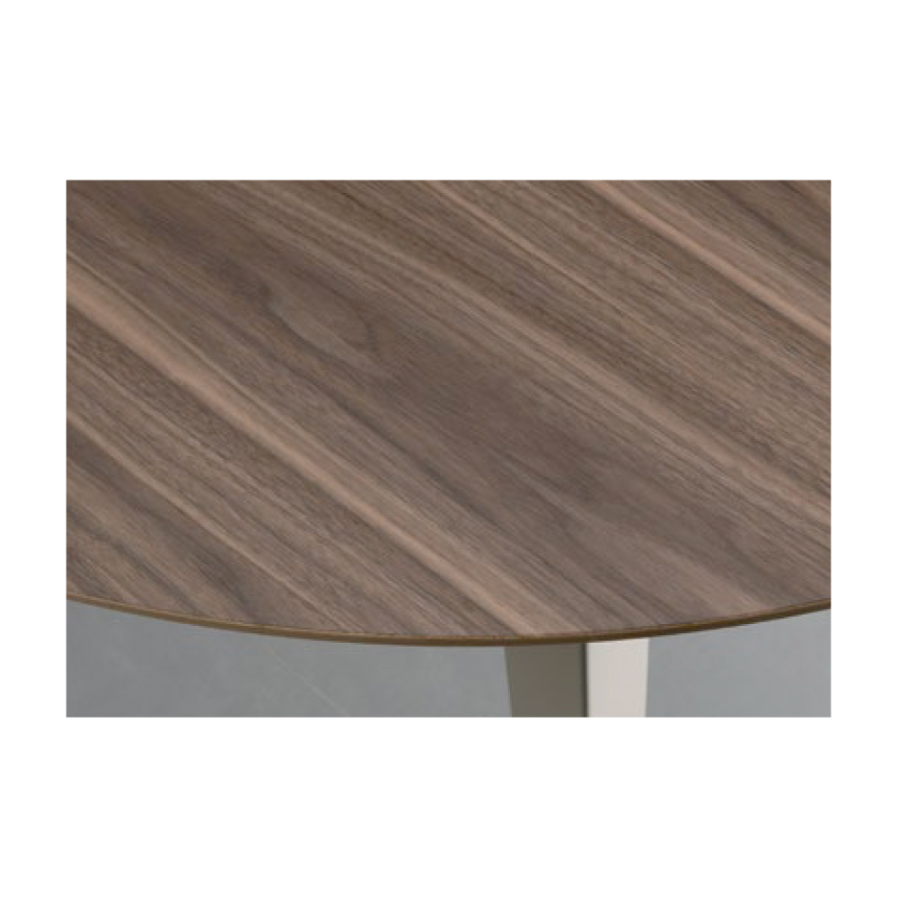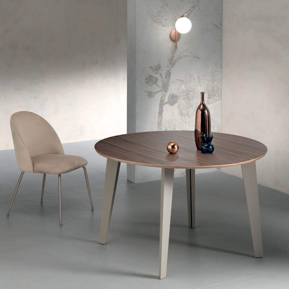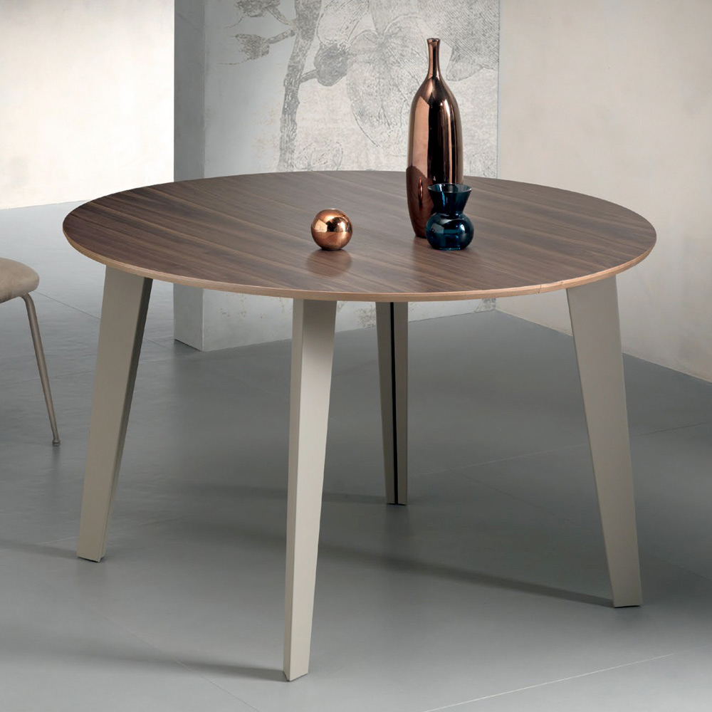 Okrągły stół o średnicy 120 cm, rozkładany do 276 lub 380 cm, z blatem z forniru z orzecha Canaletto o grubości 20 mm i pochylonym profilem.