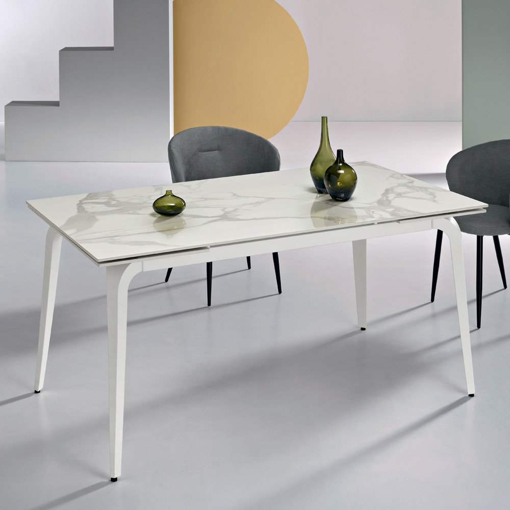 Rozkładany stół jadalny o nowoczesnym designie, idealny do eleganckiego umeblowania salonu lub jadalni . Blat wykonany jest ze spiekanego kamienia imitującego marmur – trwałego i łatwego w utrzymaniu materiału, który doda każdej przestrzeni nowoczesnego charakteru.