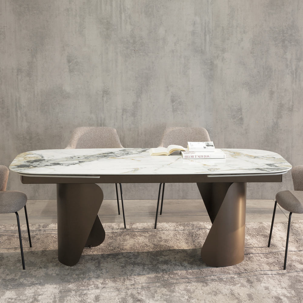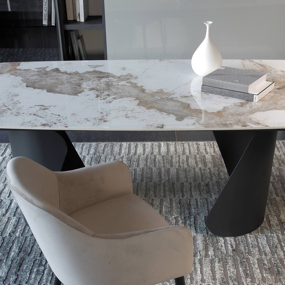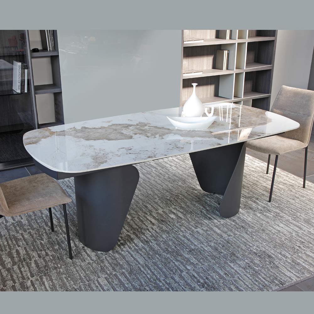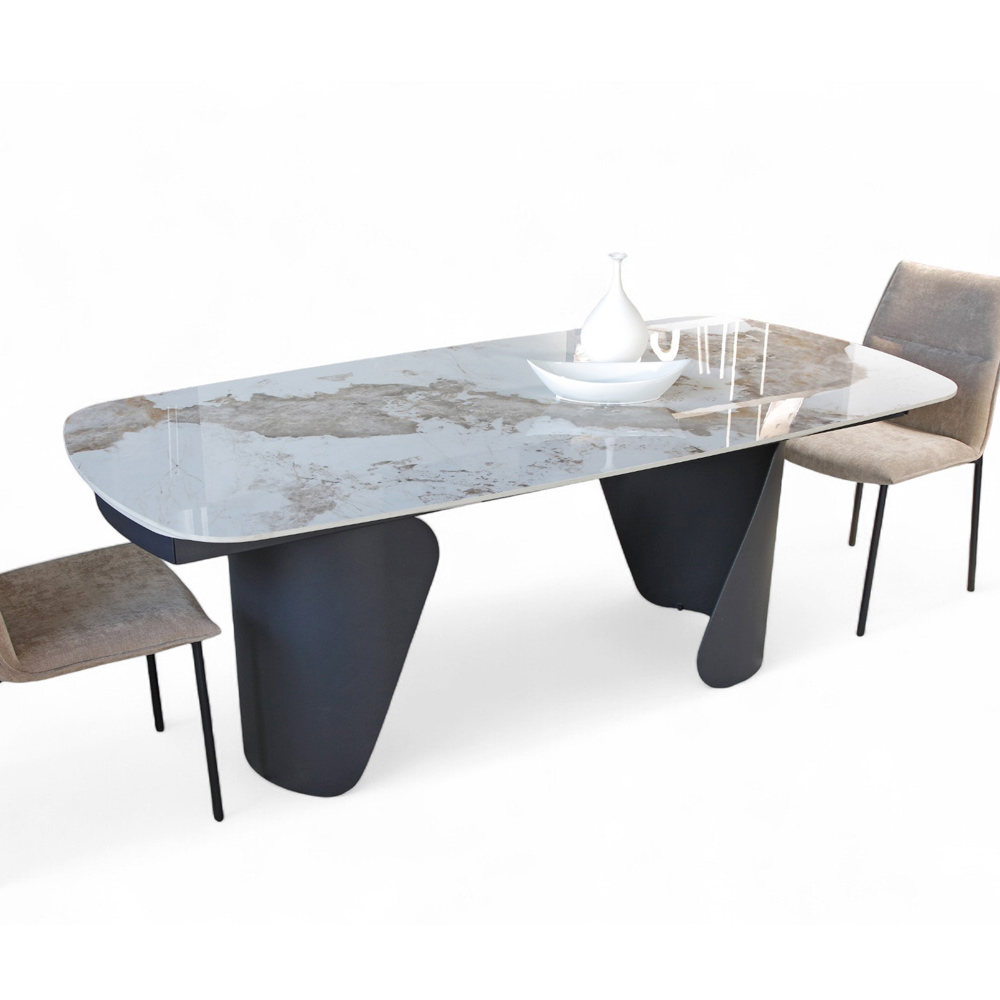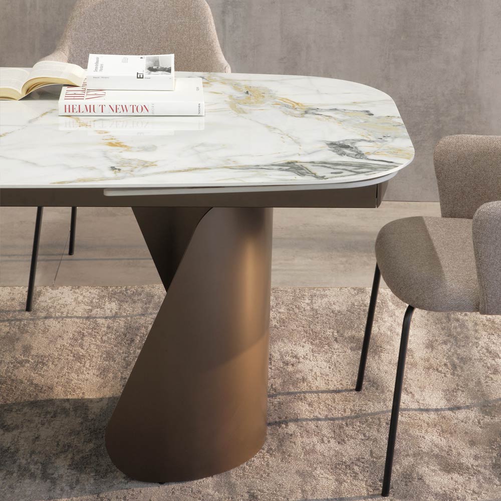 Rzeźbiarska podstawa z malowanego metalu zapewnia stabilność i silny charakter stołu, tworząc interesujący kontrast materiałowy z powierzchnią. Asymetryczne geometryczne kształty nóg dodają artystycznego i wyrafinowanego akcentu do całego projektu.