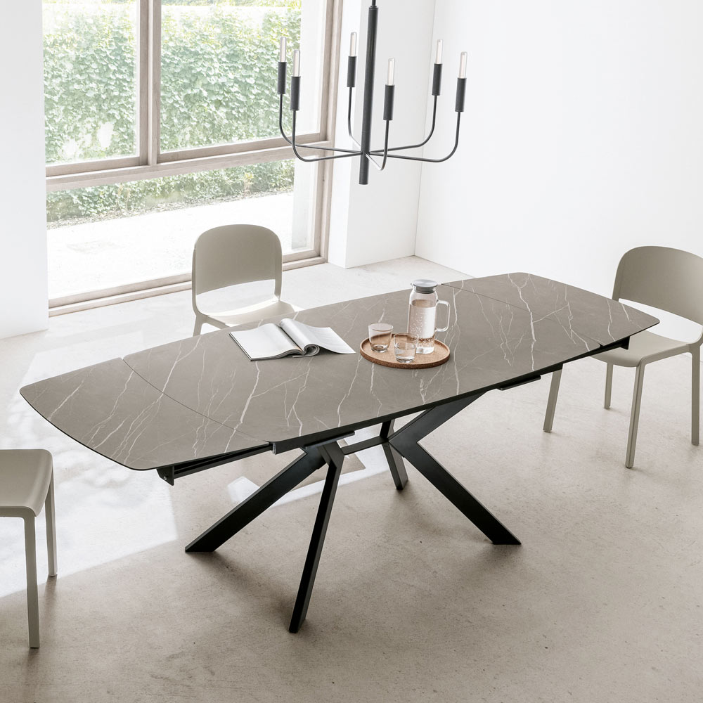 Blat HPL z żyłkowaniem oferuje wyrafinowaną i naturalną estetykę, z odporną powierzchnią, idealną do codziennego użytku. Dzięki systemowi rozkładania z bocznymi przedłużeniami stół rozkłada się z niezwykłą łatwością, dostosowując się do rodzinnych obiadów lub wieczorów ze znajomymi.