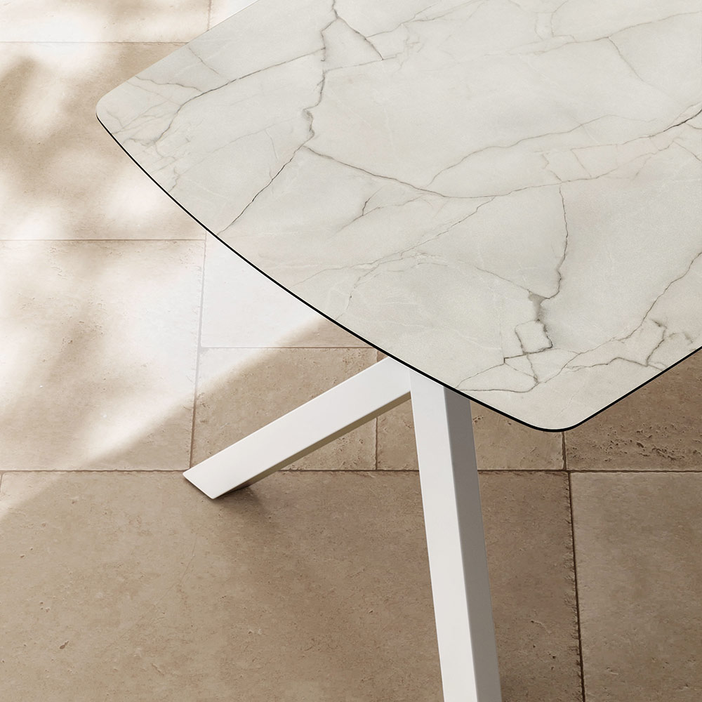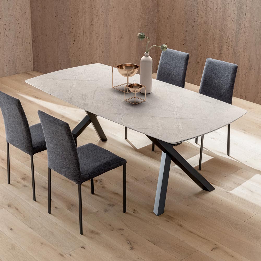 Malowana metalowa konstrukcja ze skrzyżowanymi nogami, które robią duże wrażenie, zapewnia stabilność, wytrzymałość i styl architektoniczny , dzięki czemu stół ten doskonale nadaje się do nowoczesnych, eleganckich i otwartych przestrzeni .