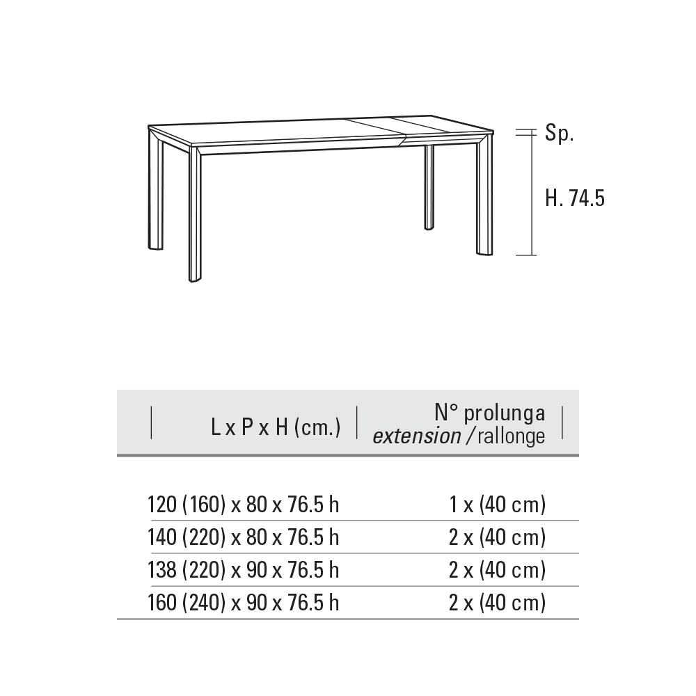 Dostępne rozmiary:- Dł. 120/160 x gł. 80 x wys. 76,5 cm (1 przedłużenie);