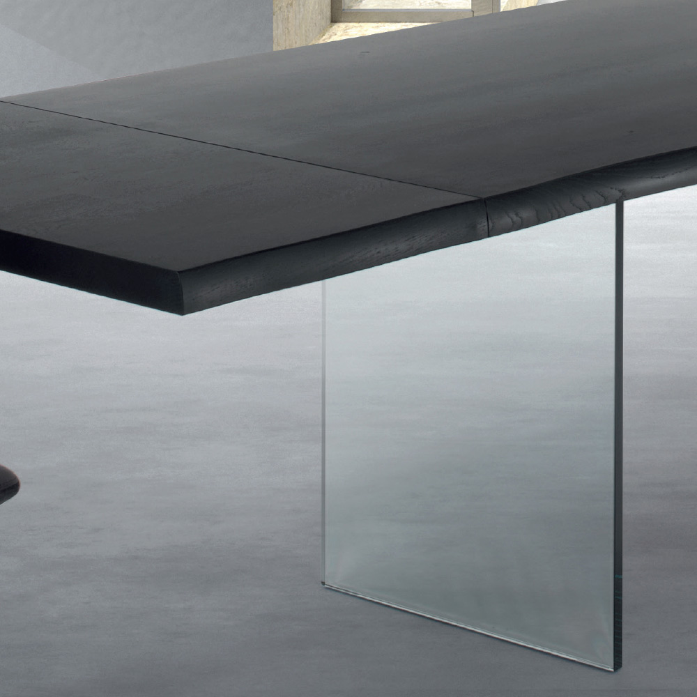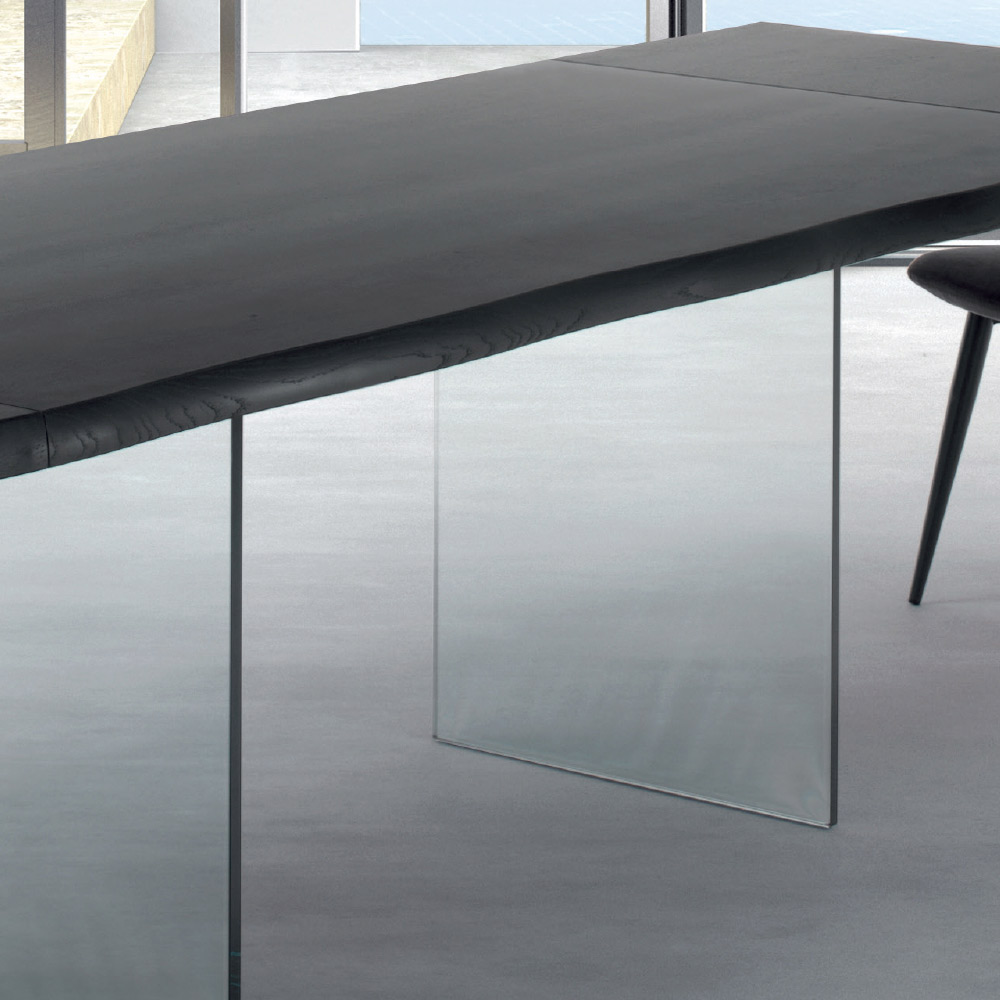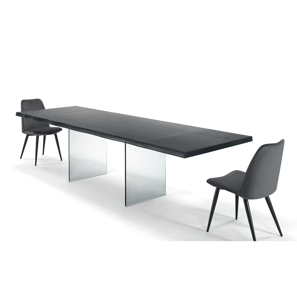 Rozkładany stół do jadalni o długości do 300 cm z blatem z fornirowanego drewna i szklaną podstawą wyprodukowaną we Włoszech.