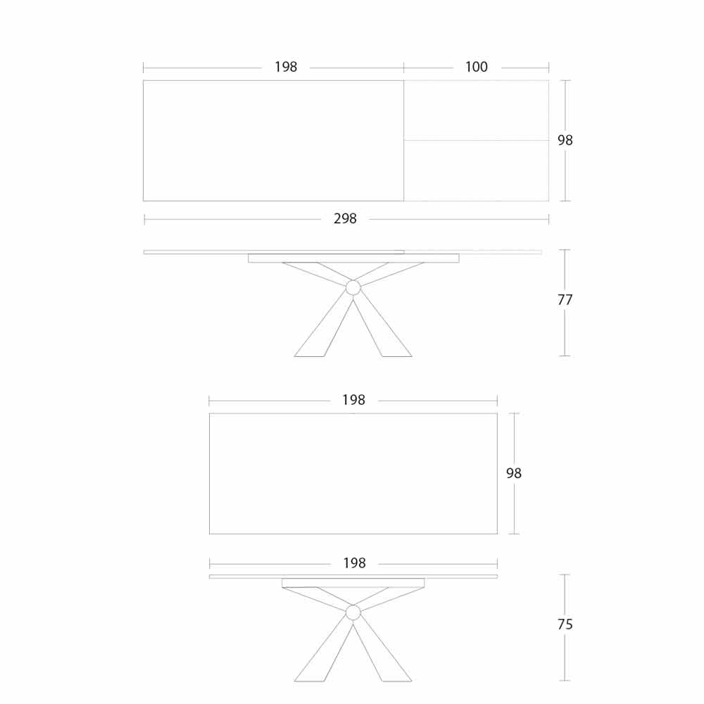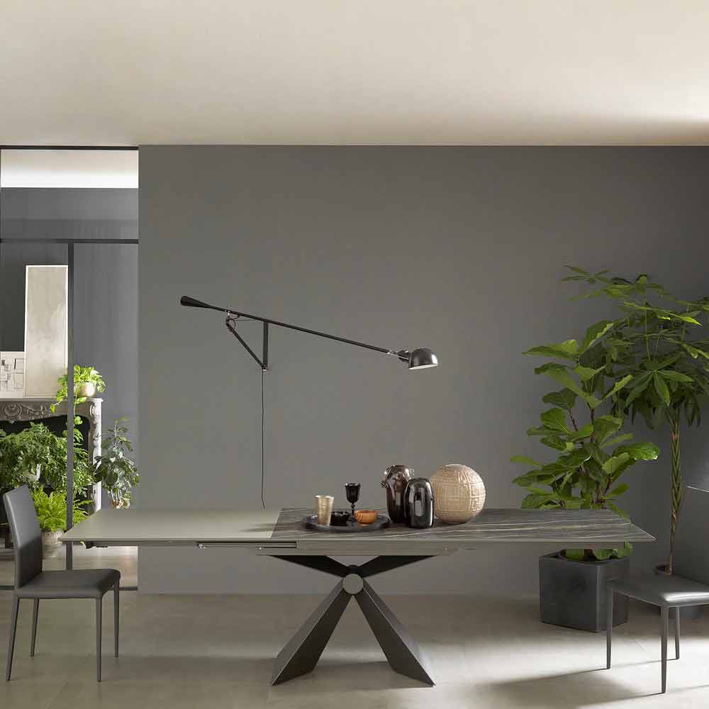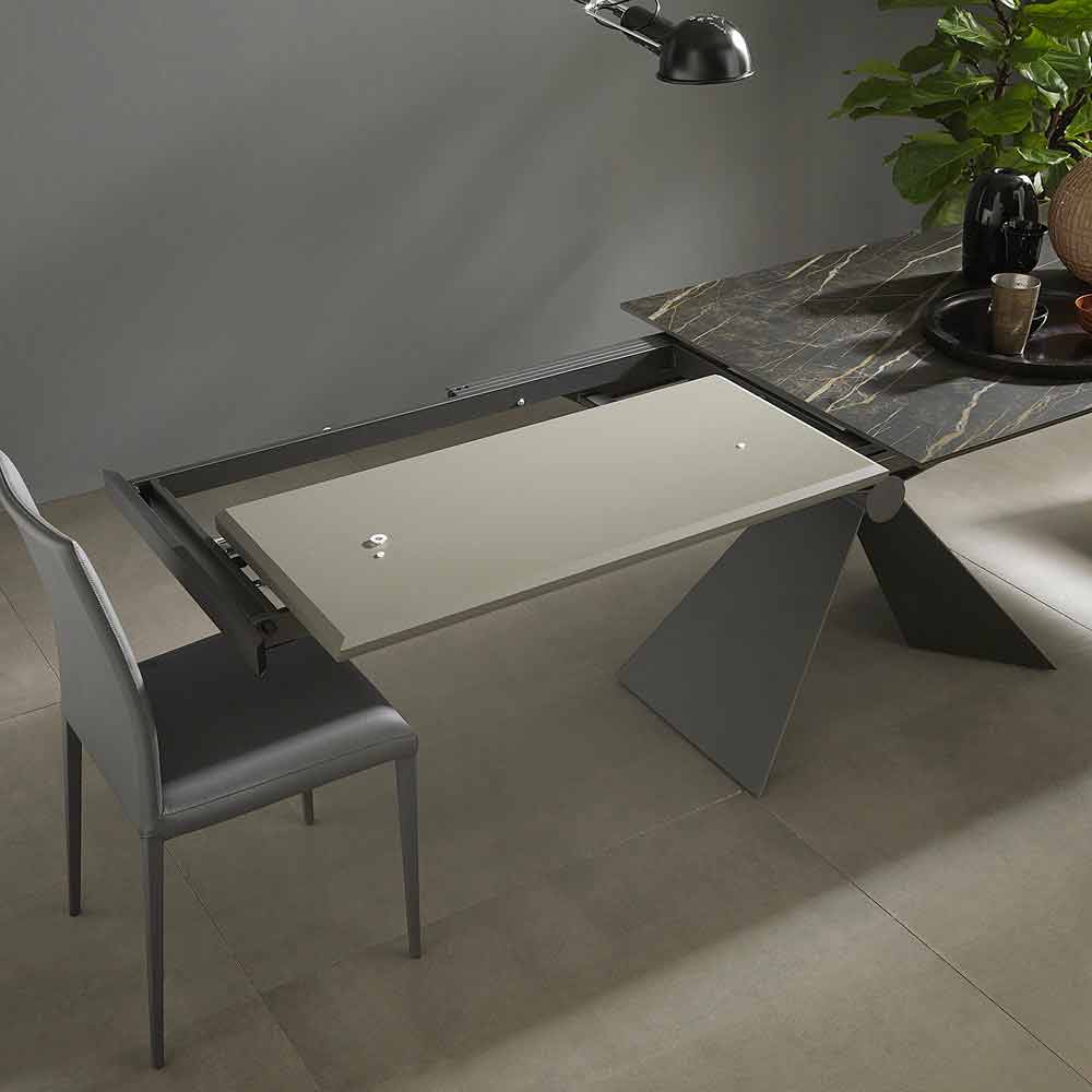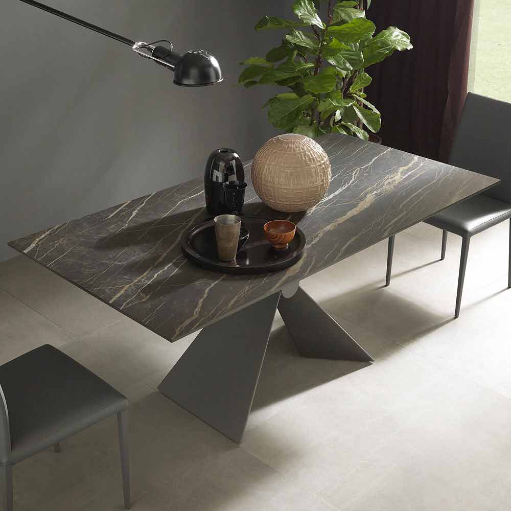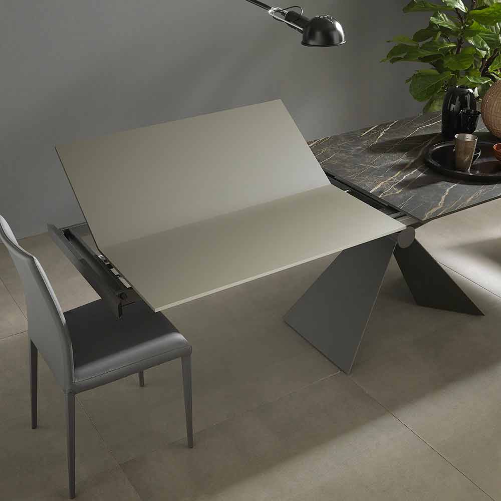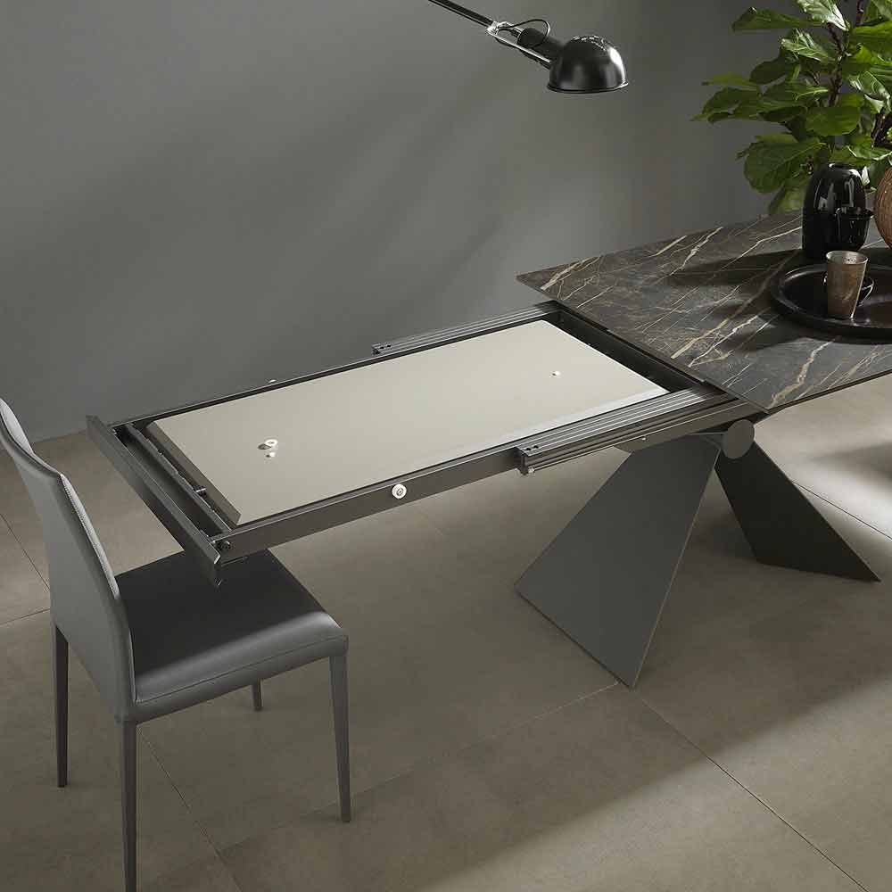 Rozkładana podstawa stołu do jadalni z metalowym sękiem i ceramicznym blatem wyprodukowanym we Włoszech.