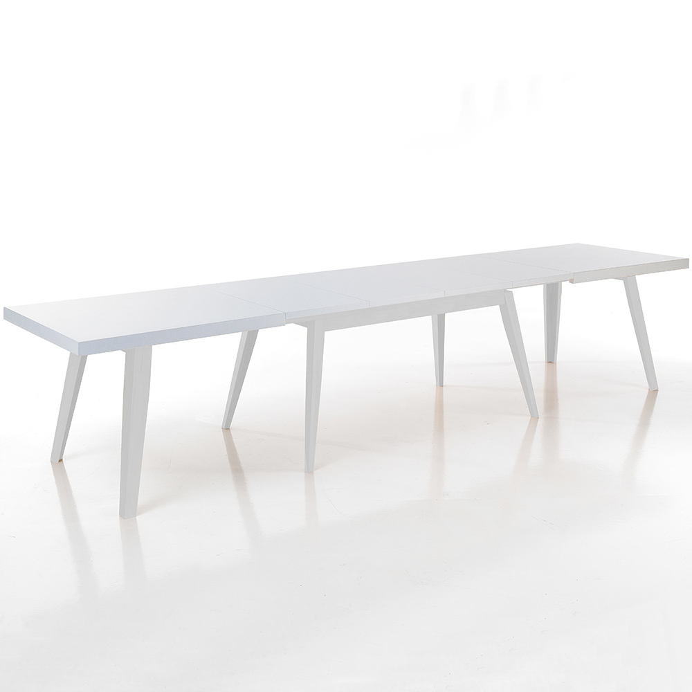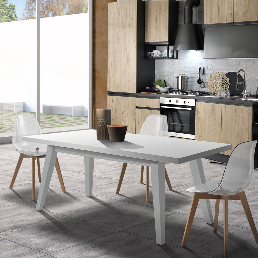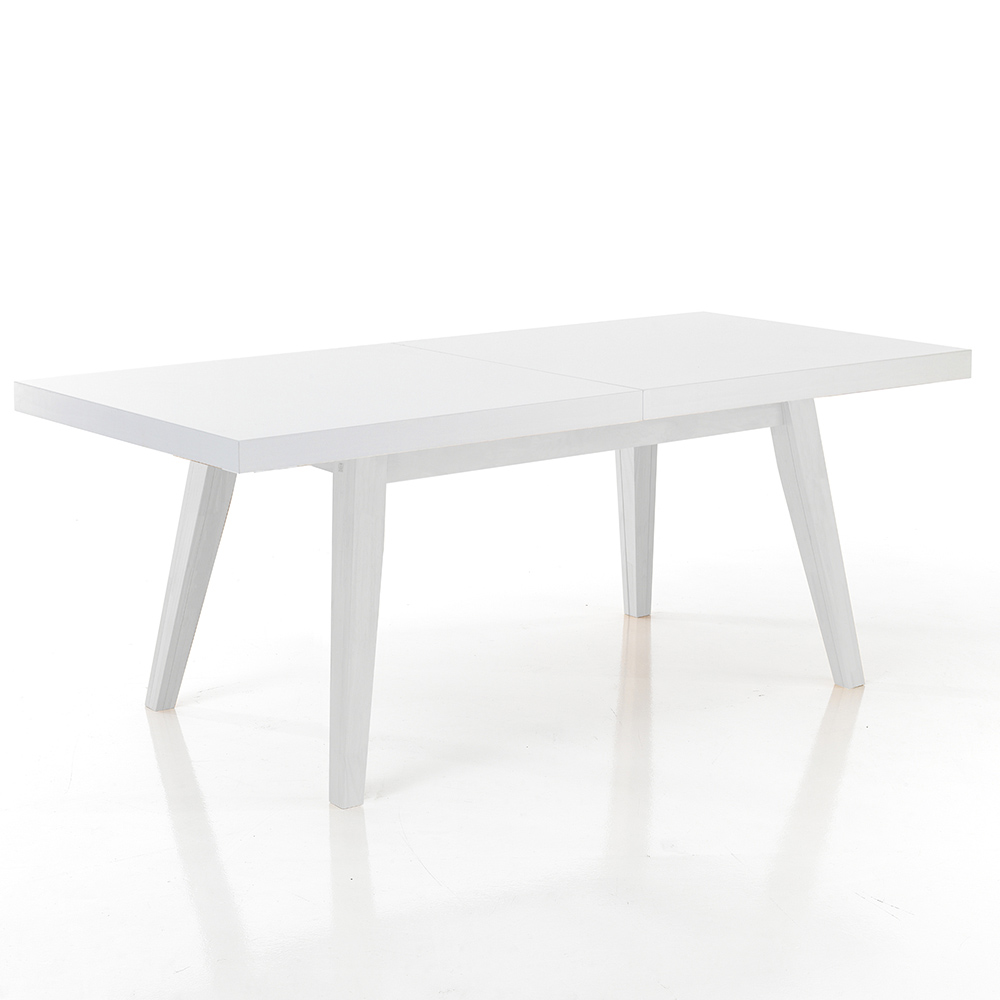 półmatowej lakierowanej na biało płyty mdf z 4 przedłużeniami umieszczonymi pod blatem. Dzięki możliwości rozbudowy może pomieścić większą liczbę znajomych i bliskich, aby spędzić miłe wieczory w towarzystwie.