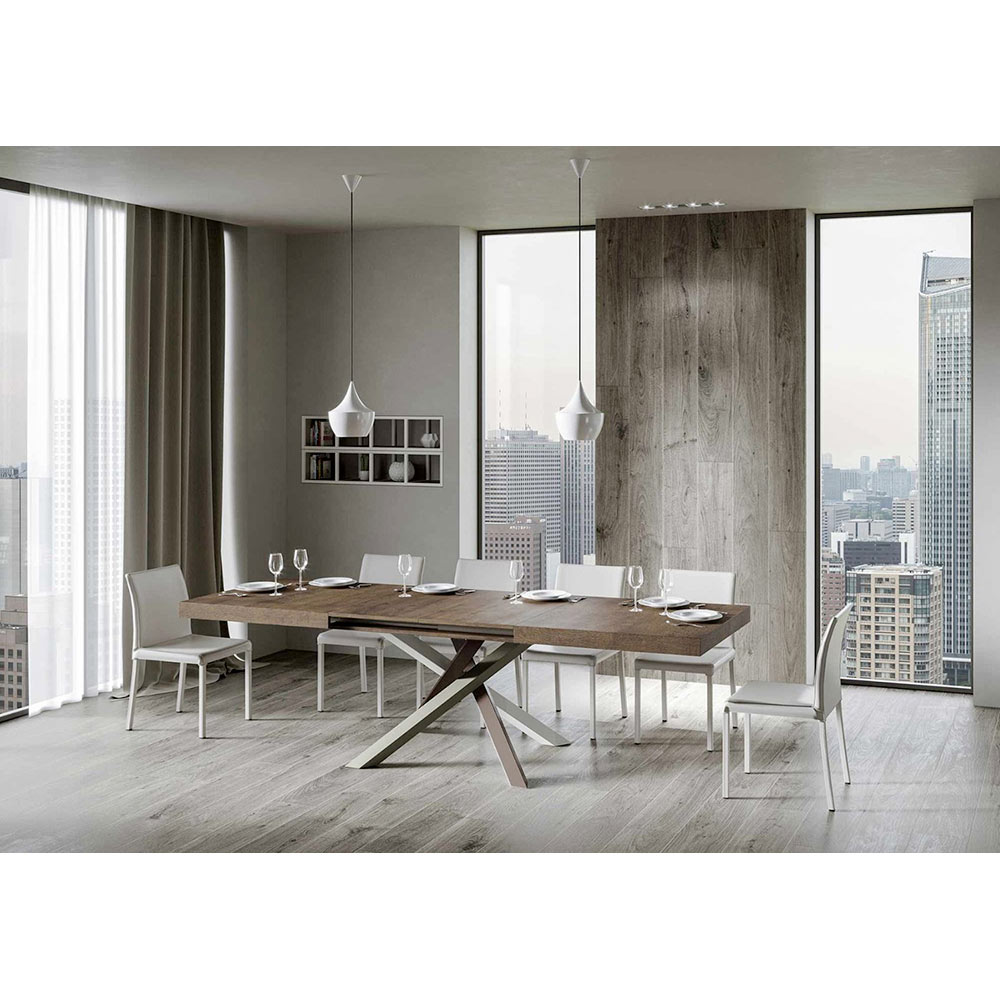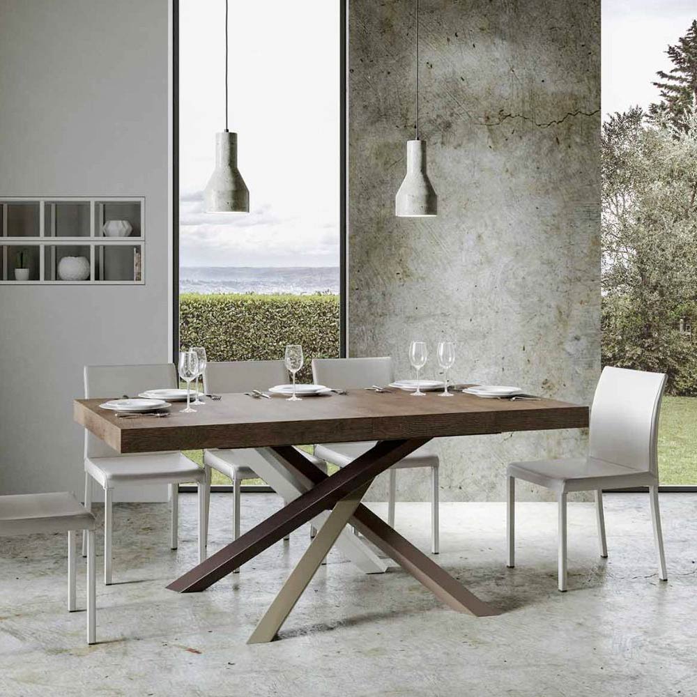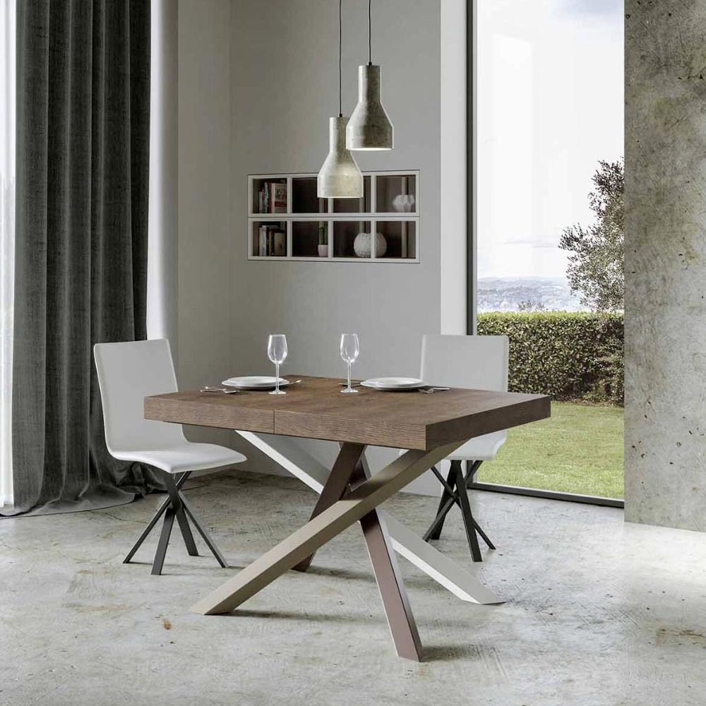 Odkryj rozkładany stół, arcydzieło nowoczesnego designu, które wyróżnia się wyjątkową sylwetką i wszechstronną funkcjonalnością. Drewniany blat zwiększa jasność przestrzeni, oferując gładką i solidną powierzchnię, która zachęca do codziennego użytkowania. Podstawa stołu to prawdziwy geometryczny spektakl, ze skrzyżowanymi nogami, które przeplatają się w grze kolorów. Proponowana kombinacja to: Noga 1: Czysta biel (RAL 9010). Noga 2: Jasnobrązowy (RAL 8025). Noga 3: Oliwkowa szarość (RAL 7002). Noga 4: Czekoladowy brąz (RAL 8017) Kolory RAL są nieprzezroczyste. Ta kombinacja nie tylko dodaje witalności do projektu, ale także zapewnia stabilność i wytrzymałość. Mechanizm rozkładania stołu jest równie prosty, co inżynieryjny, dzięki czemu ten elegancki mebel można przekształcić z praktycznego stołu dla czterech osób w przytulną przestrzeń do organizowania kolacji i większych spotkań.