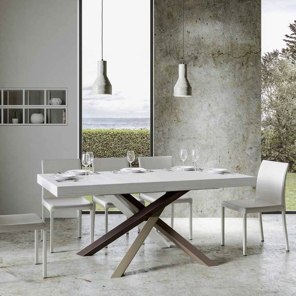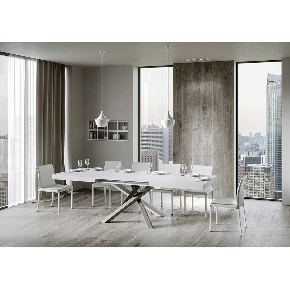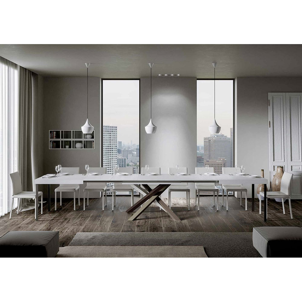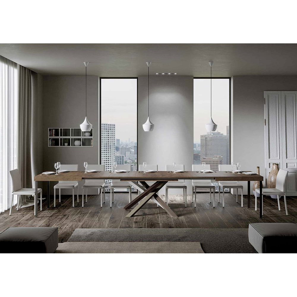 Odkryj rozkładany stół, arcydzieło nowoczesnego designu, które wyróżnia się wyjątkową sylwetką i wszechstronną funkcjonalnością. Drewniany blat zwiększa jasność przestrzeni, oferując gładką i solidną powierzchnię, która zachęca do codziennego użytkowania. Podstawa stołu to prawdziwy geometryczny spektakl, ze skrzyżowanymi nogami, które przeplatają się w grze kolorów. Proponowana kombinacja to: Noga 1: Czysta biel (RAL 9010). Noga 2: Jasnobrązowy (RAL 8025). Noga 3: Oliwkowa szarość (RAL 7002). Noga 4: Czekoladowy brąz (RAL 8017) Kolory RAL są nieprzezroczyste. Ta kombinacja nie tylko dodaje witalności do projektu, ale także zapewnia stabilność i wytrzymałość. Mechanizm rozkładania stołu jest równie prosty, co inżynieryjny, dzięki czemu ten elegancki mebel można przekształcić z praktycznego stołu dla czterech osób w przytulną przestrzeń do organizowania kolacji i większych spotkań.