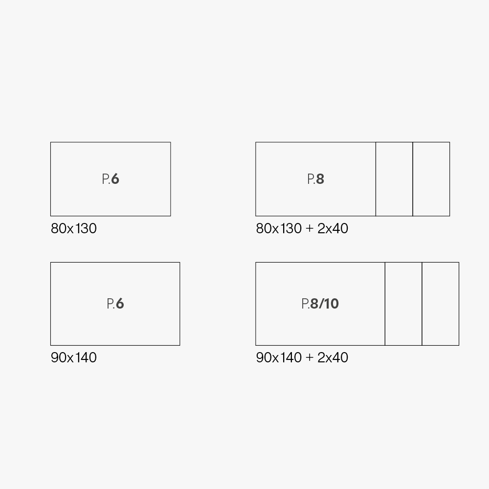 Dostępne rozmiary:- długość 130/210 cm x głębokość 80 cm x wysokość 75,5 cm - 2 przedłużenia po 40 cm