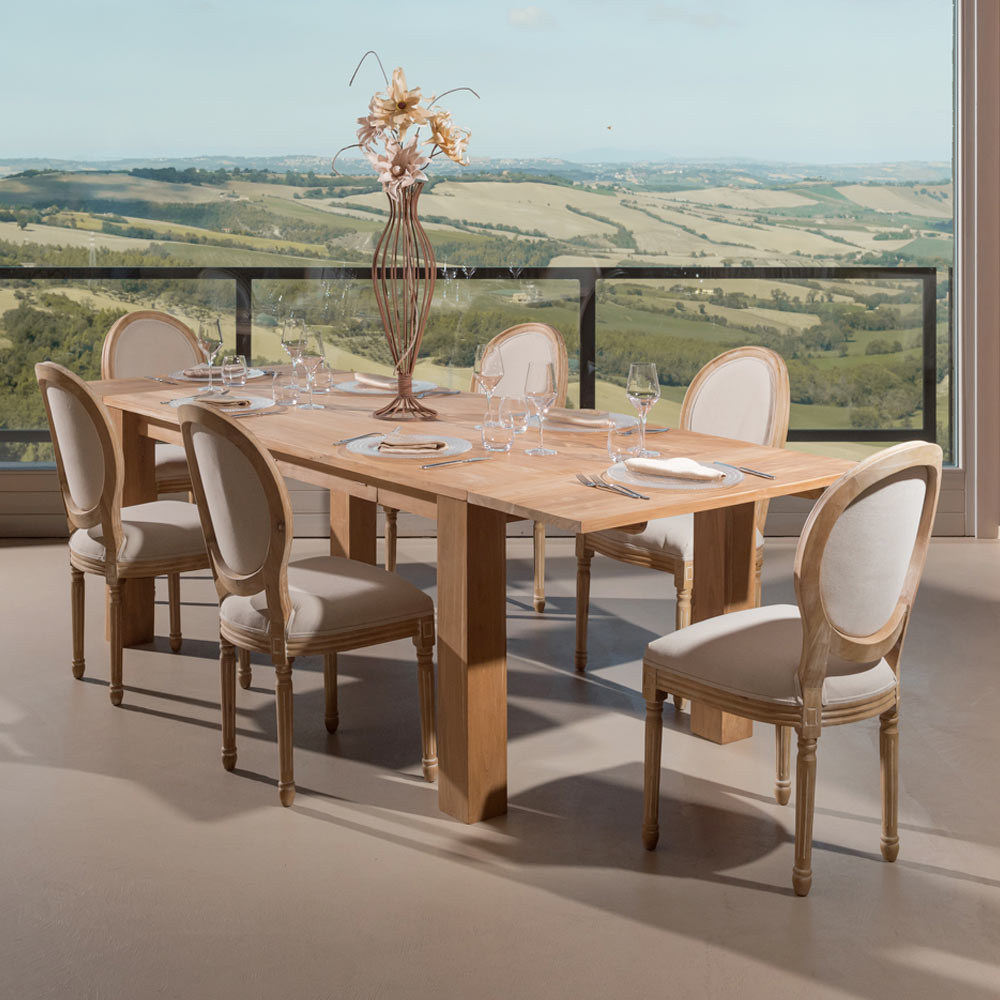 Ten rozkładany stół z litego drewna tekowego to praktyczne i eleganckie rozwiązanie, idealne do jadalni lub kuchni. Solidna konstrukcja i kunszt wykonania podkreślają naturalne usłojenie drewna , nadając wnętrzu ciepła i charakteru.