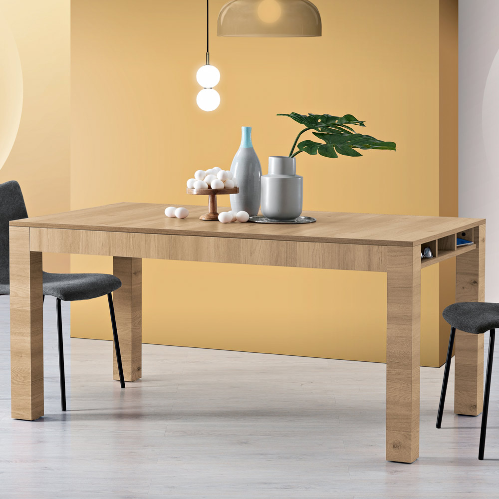 W tym rozkładanym stole naturalne ciepło drewna spotyka się z pomysłowością współczesnego designu. Wykończenia są nie tylko piękne, ale także zapewniają trwałą powierzchnię odporną na codzienne użytkowanie, idealną do organizacji począwszy od prostych porannych śniadań po wyrafinowane kolacje z przyjaciółmi.