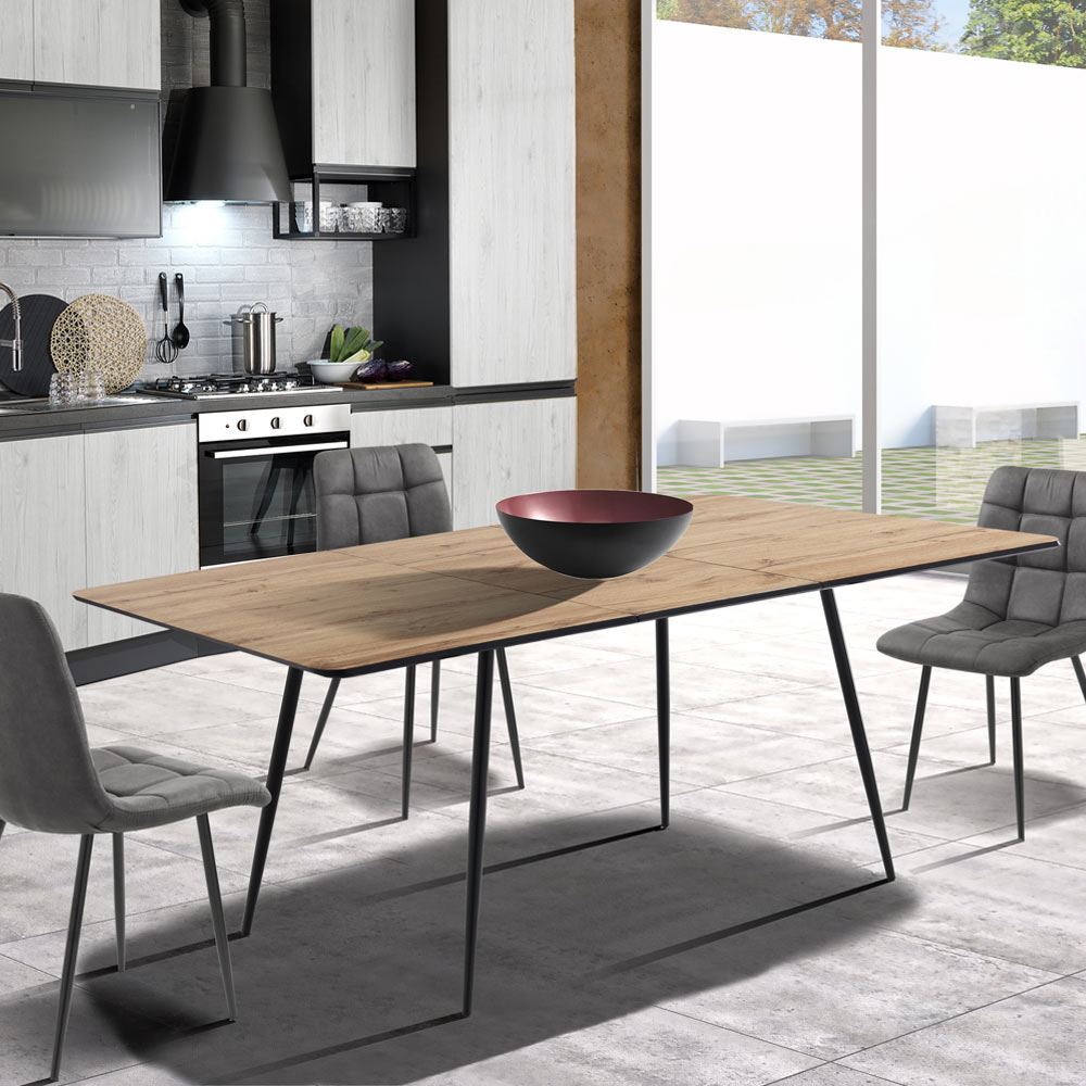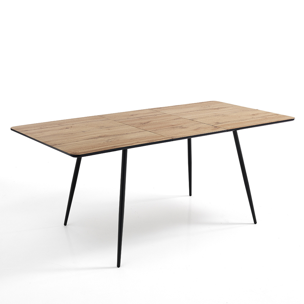 Stół rozkładany do 160 cm z blatem MDF pokrytym surową melaminą dębową z matową czarną krawędzią i nogami wykonanymi z matowego, malowanego na czarno metalu . Elastyczny materiał umieszczony pod topem. Dzięki możliwości rozbudowy może pomieścić większą liczbę znajomych i bliskich, aby spędzić miłe wieczory w towarzystwie.