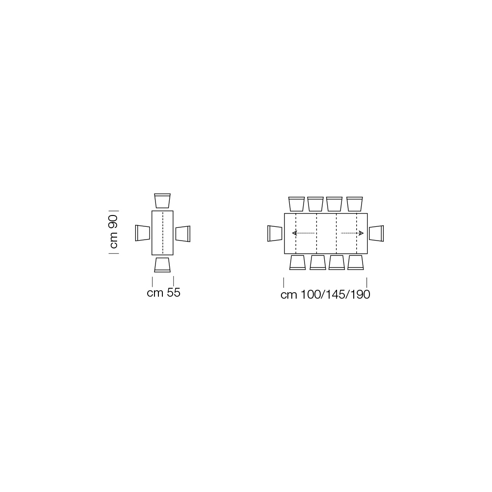 Środki- Dł. 55 (190) x gł. 90 x wys. 77 cm 10-osobowa kanapa z możliwością przedłużenia trzema zewnętrznymi przedłużkami po 45 cm każde;