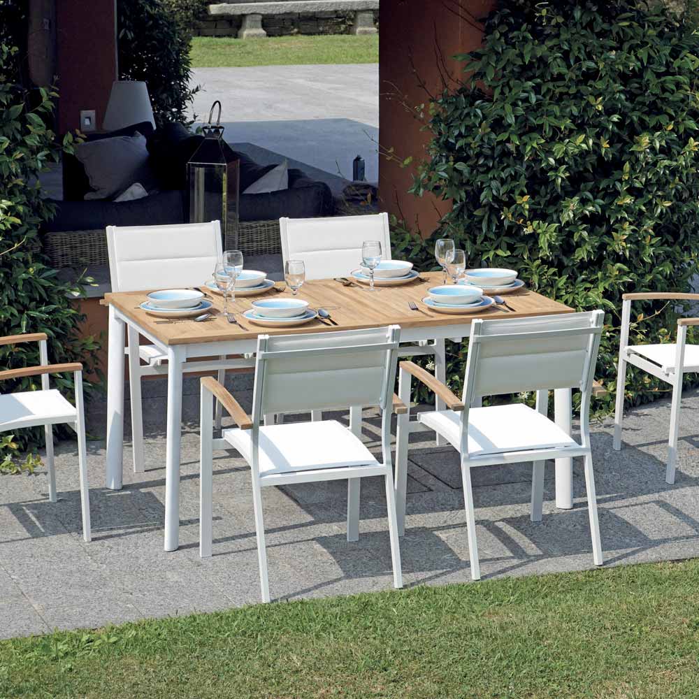 Blat stołu wykonany został z wysokiej jakości drewna tekowego , znanego ze swojej trwałości i odporności na warunki atmosferyczne. Teak w ciepłych, naturalnych odcieniach dodaje odrobinę ciepła i wyrafinowania Twojej przestrzeni zewnętrznej. Solidne, lekkie aluminiowe nogi zapewniają doskonałą stabilność i odporność na korozję, dzięki czemu stół zachowuje swoje piękno przez długi czas.