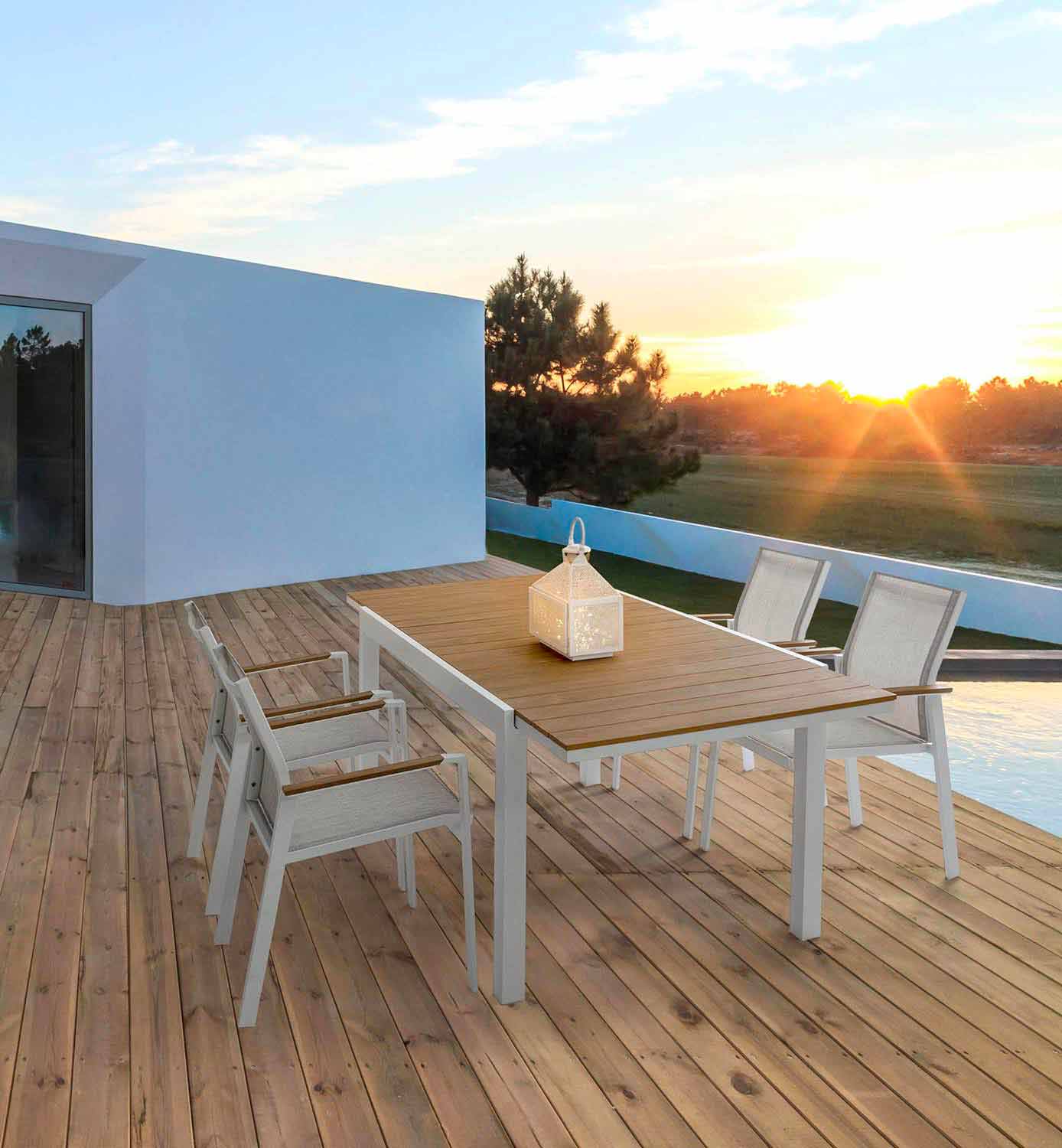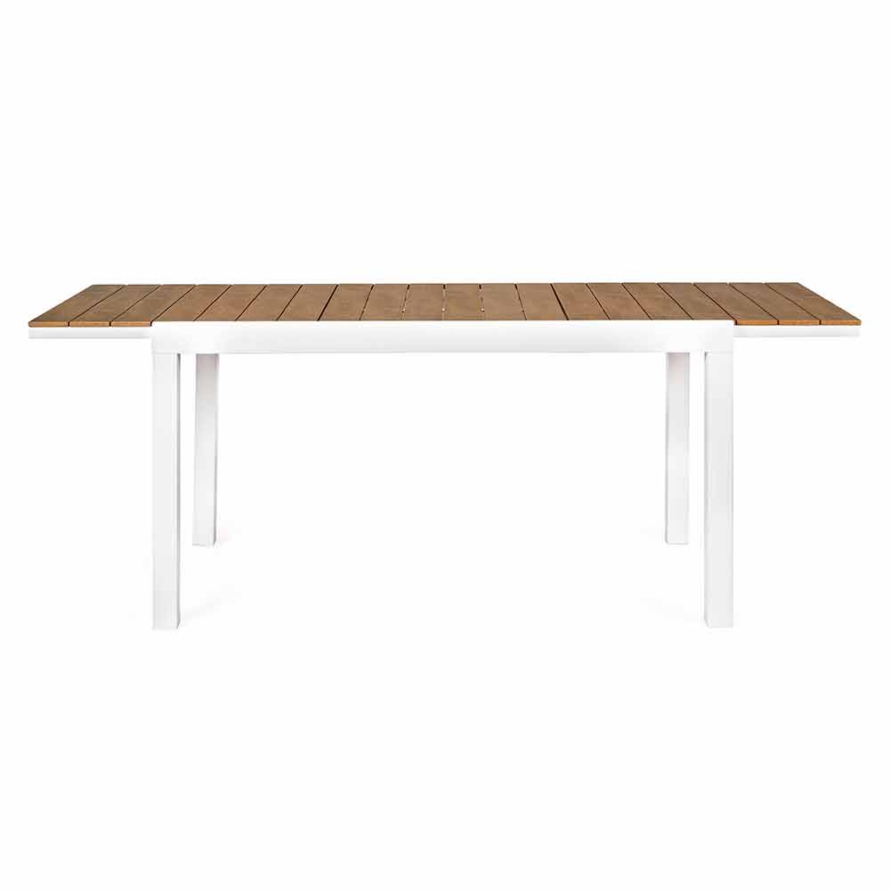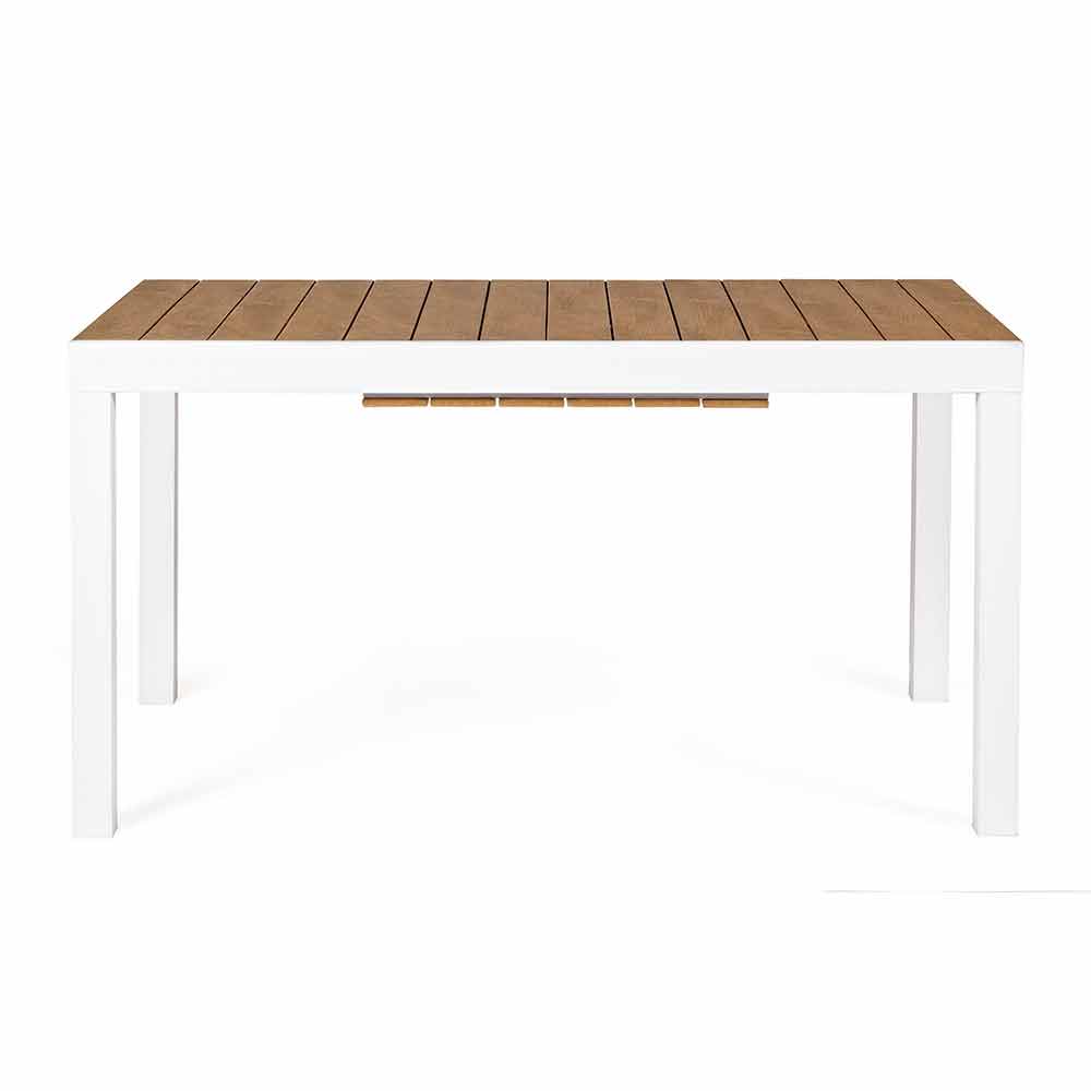 Rozkładany stół zewnętrzny z ukrytym centralnym przedłużeniem, nowoczesny design, biała aluminiowa konstrukcja z blatem drewnopodobnym.