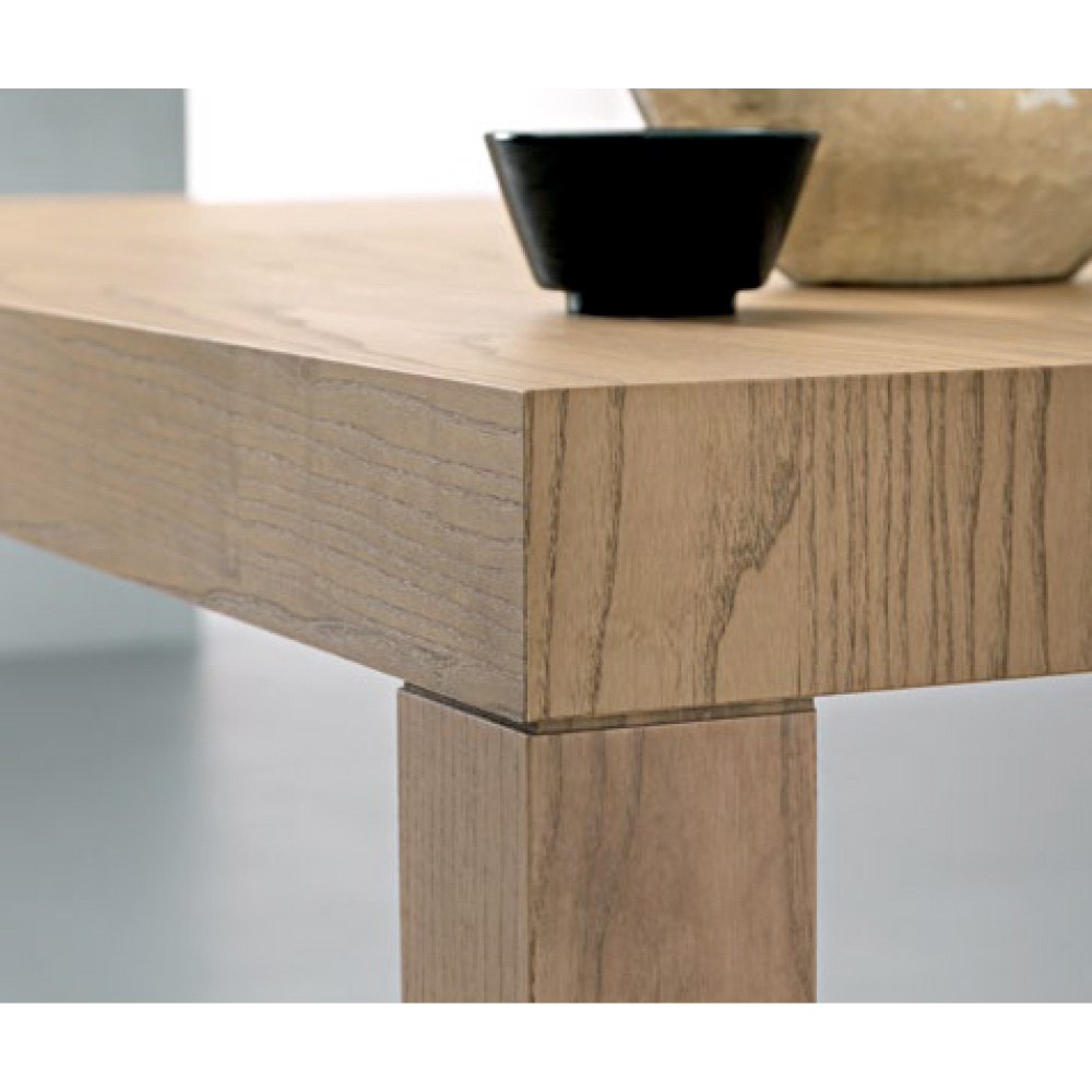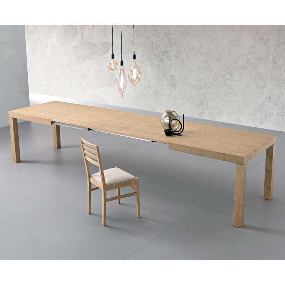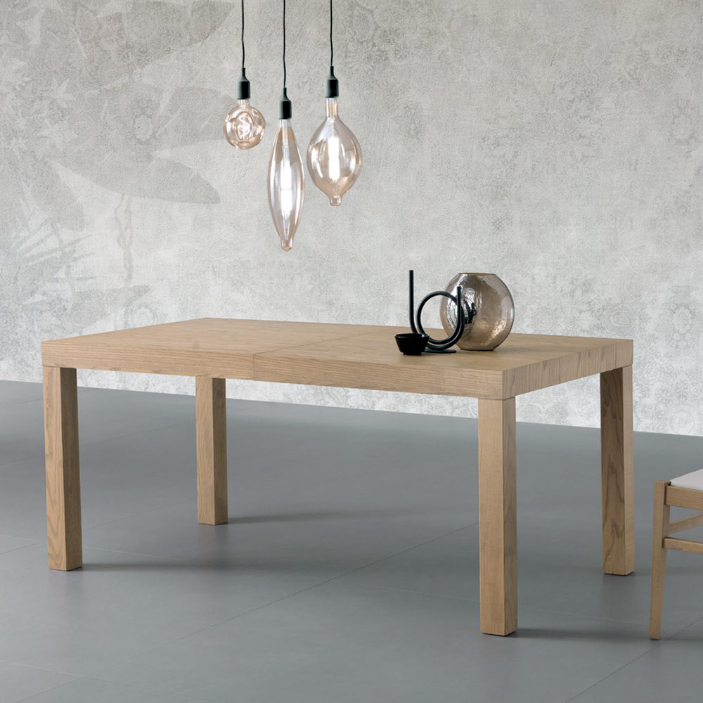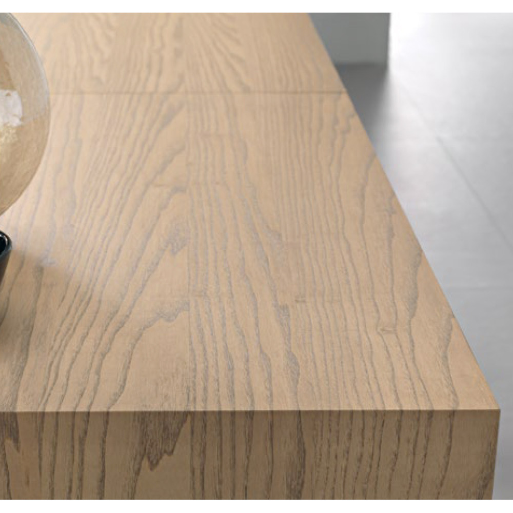 Rozkładany stół prostokątny z blatem z forniru jesionowego. Grubość 80 mm, składane wykończenie.