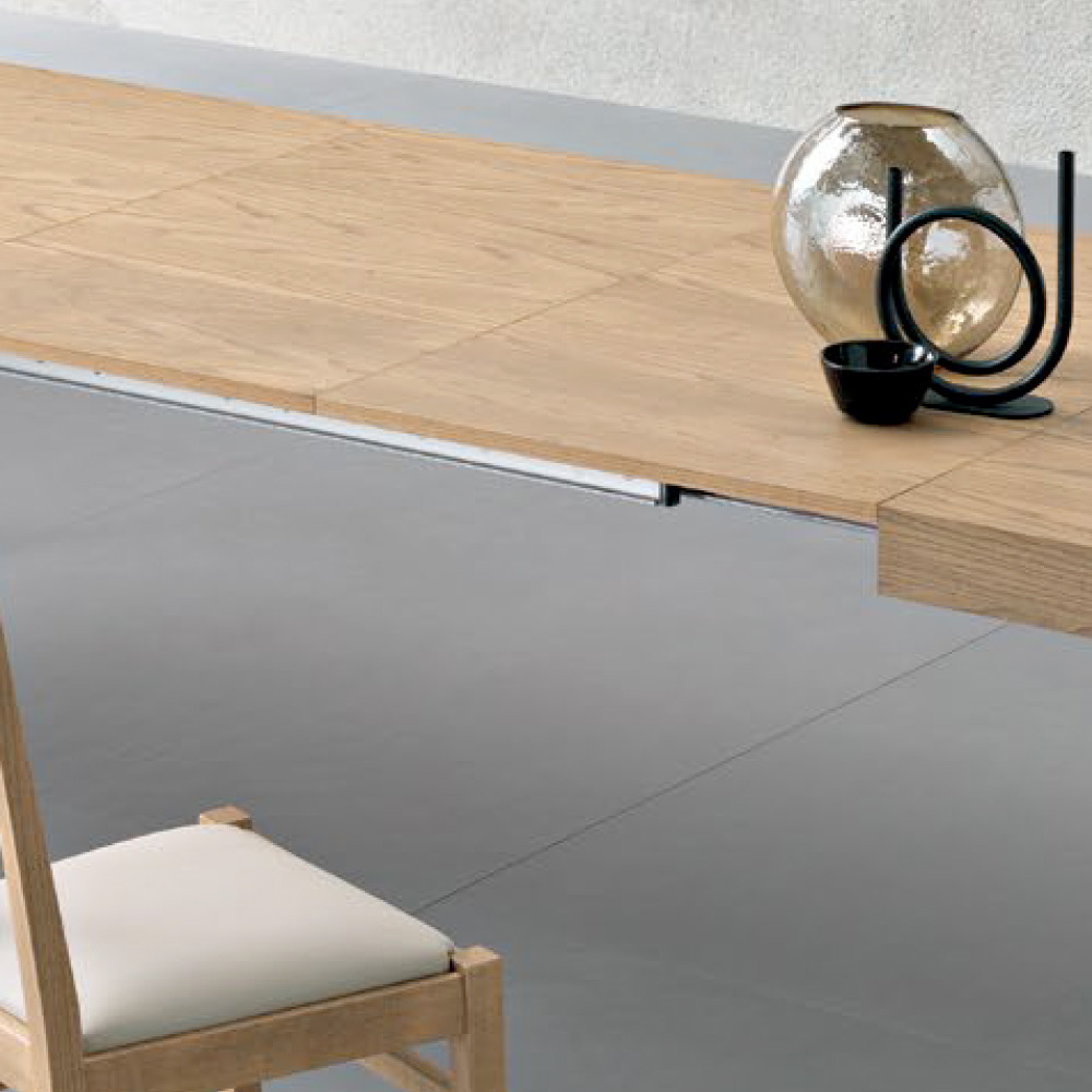 Solidne nogi z drewna jesionowego wyposażone w kółka, a całość uzupełnia malowana aluminiowa rama z obrotowymi urządzeniami pokrytymi teflonem, dzięki którym centralne otwieranie i zamykanie stołu przebiega cicho i płynnie.
