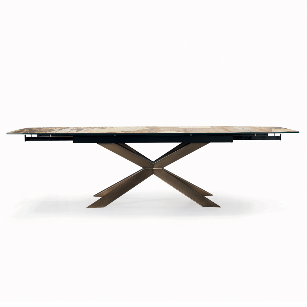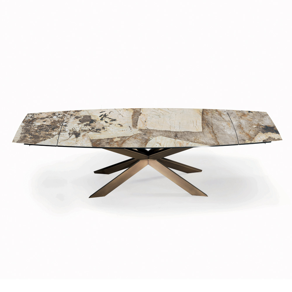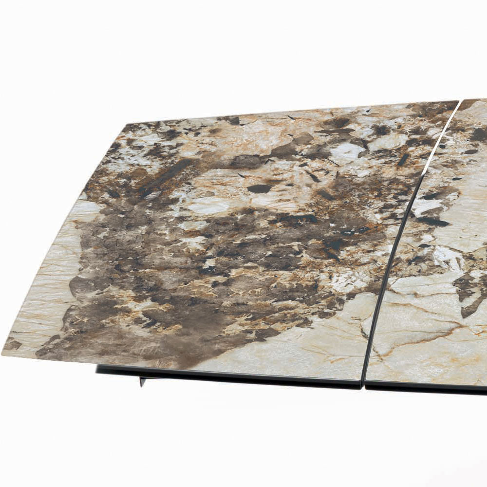 Rozkładany stół do salonu w kształcie beczki ze zintegrowanymi przedłużeniami, ceramiczny blat z polerowanym wykończeniem typu Deset Soul , prosta krawędź, stalowa podstawa lakierowana w