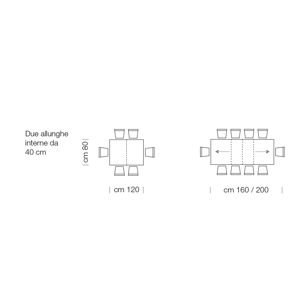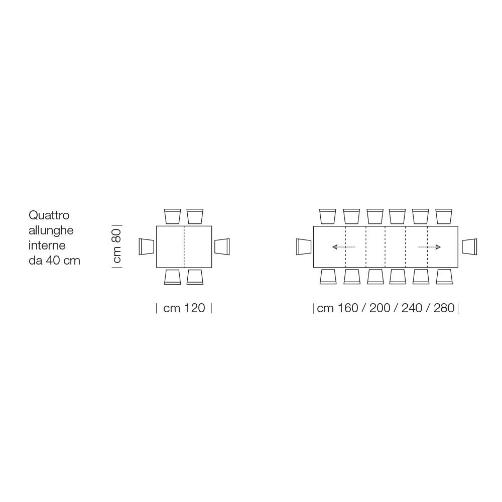 - Dł. 120 (280) x gł. 80 x wys. 77 cm 14-miejscowe siedzisko z możliwością przedłużenia czterema wewnętrznymi przedłużeniami o długości 40 cm;