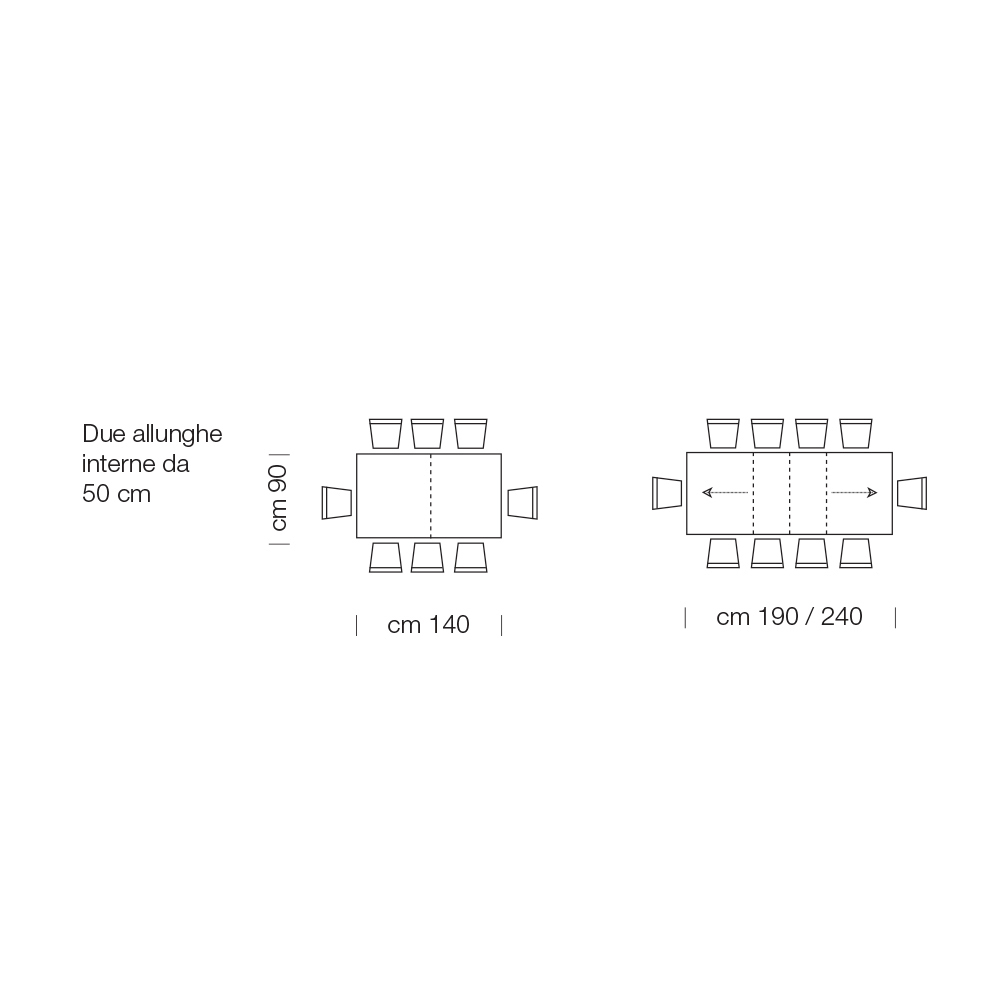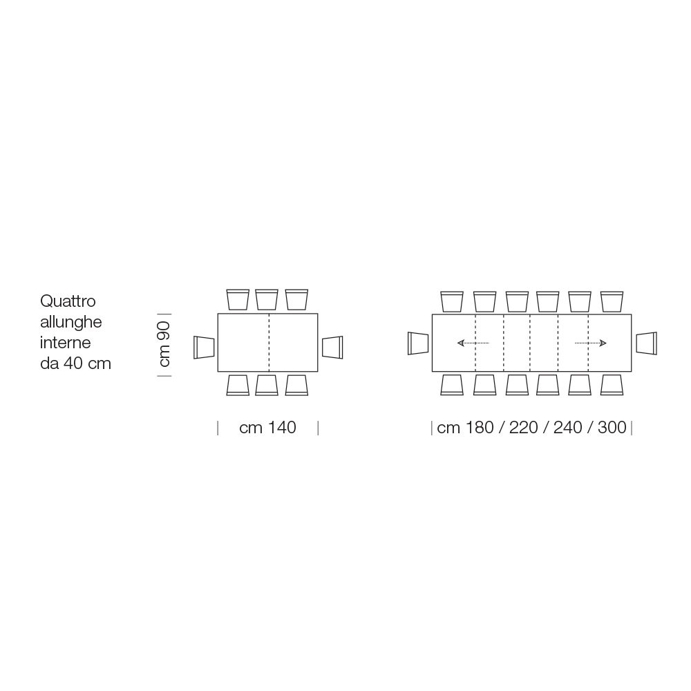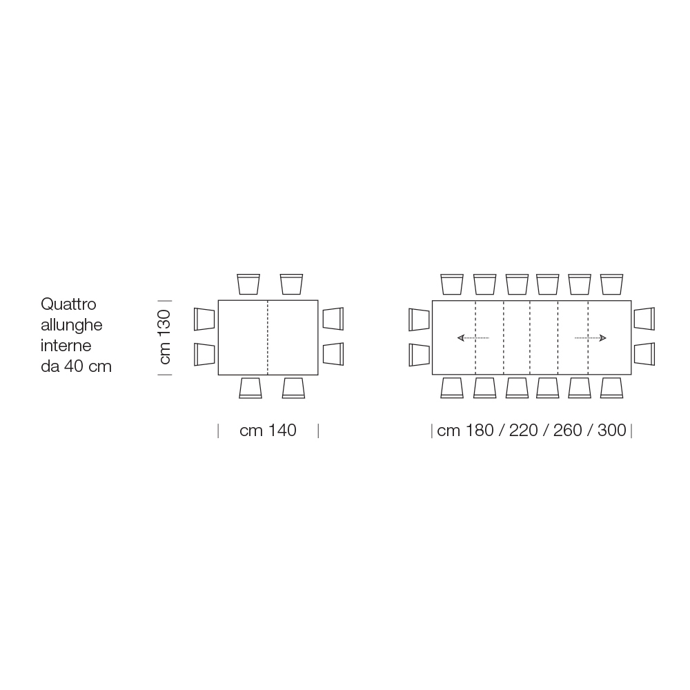 - Dł. 140 (410) x gł. 90 x wys. 77 cm 18-osobowy z możliwością przedłużenia za pomocą sześciu przedłużeń 45 cm, trzech wewnętrznych i trzech dostarczanych w kartonie wielokrotnego użytku;