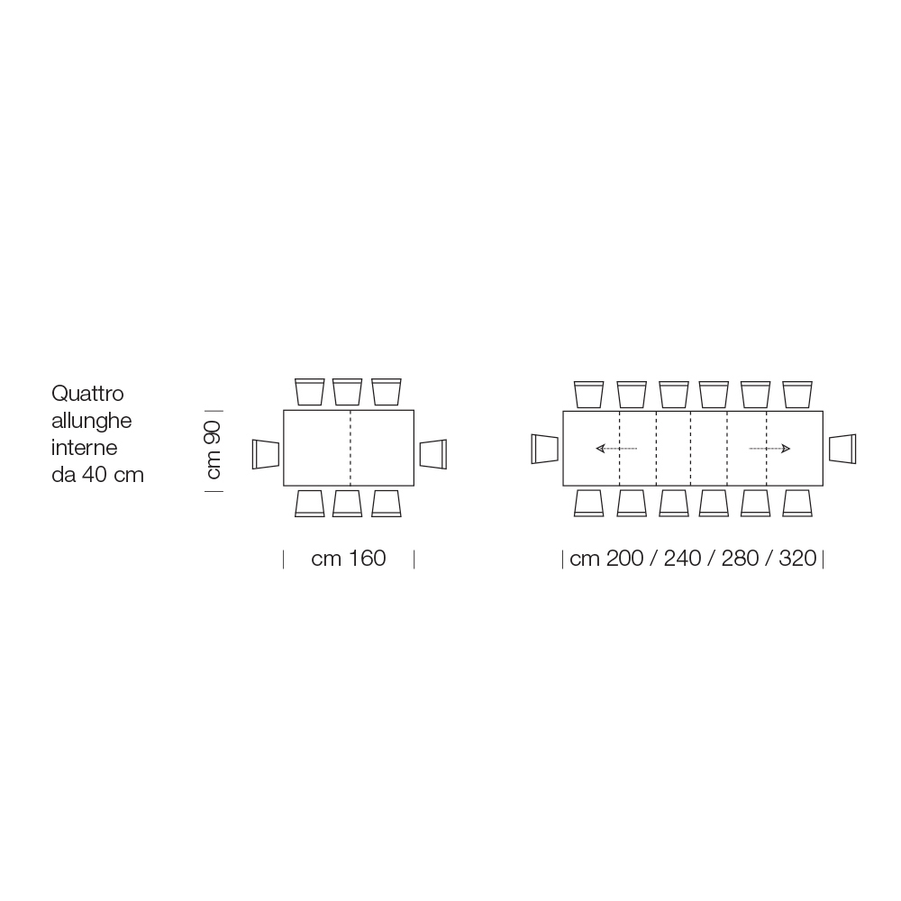 - Dł. 160 (320) x gł. 90 x wys. 77 cm 14-miejscowe siedzisko z możliwością przedłużenia czterema wewnętrznymi przedłużeniami o długości 40 cm;