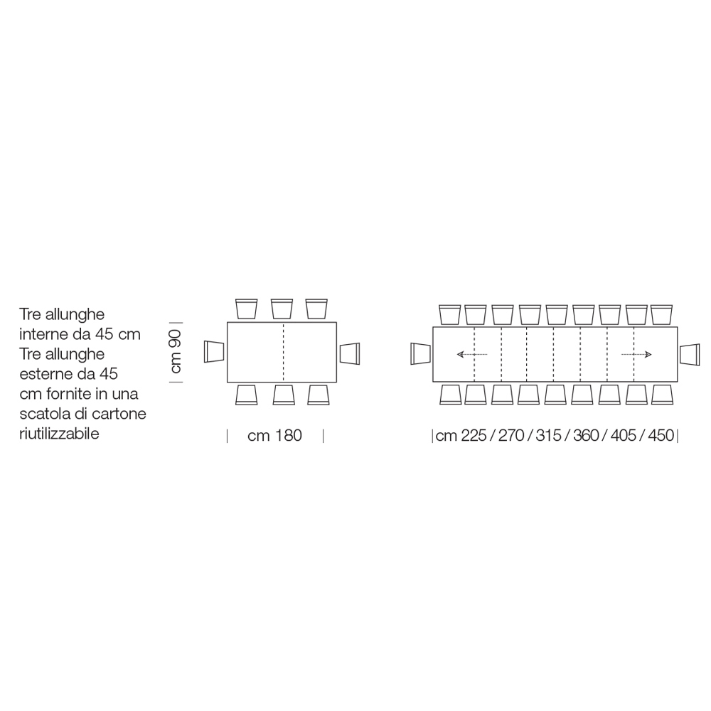 - Dł. 180 (450) x gł. 90 x wys. 77 cm 20-miejscowe siedzisko z możliwością przedłużenia za pomocą sześciu przedłużeń o długości 45 cm, trzech wewnętrznych i trzech dostarczanych w kartonowym pudełku wielokrotnego użytku;