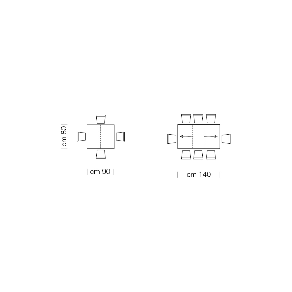 Środki- Dł. 90 (140) x gł. 80 x wys. 77 cm 8 siedzeń rozkładanych za pomocą wewnętrznego przedłużenia o 50 cm;