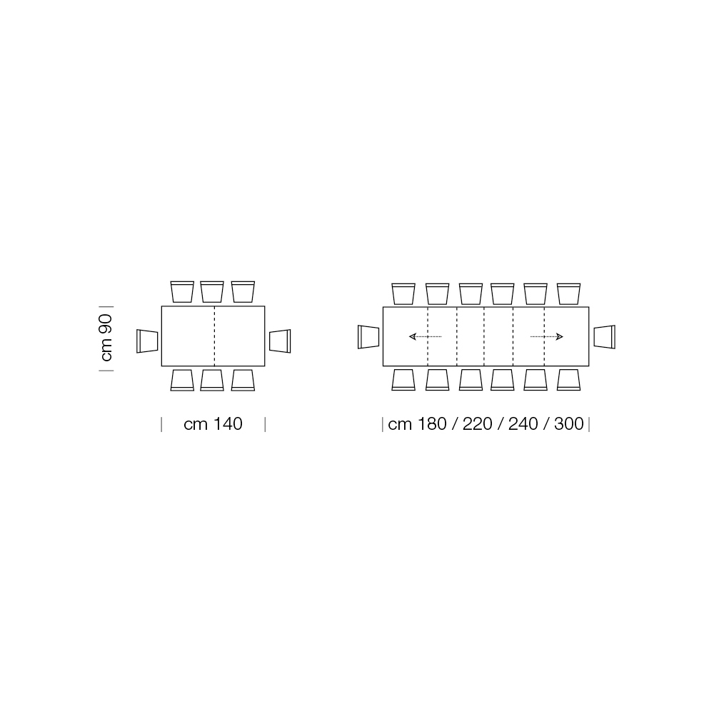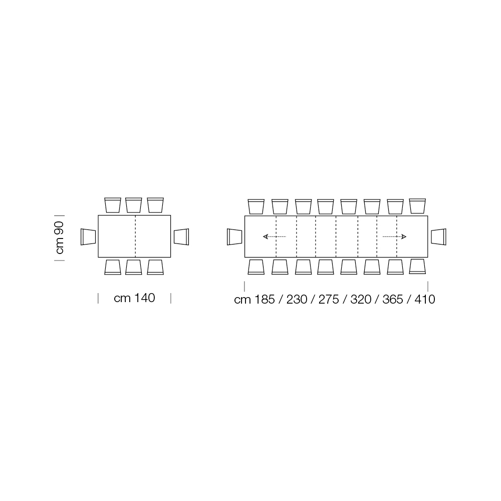 - Dł. 140 (410) x gł. 90 x wys. 77 cm 18-osobowy z możliwością przedłużenia za pomocą sześciu przedłużeń 45 cm, trzech wewnętrznych i trzech dostarczanych w kartonie wielokrotnego użytku;