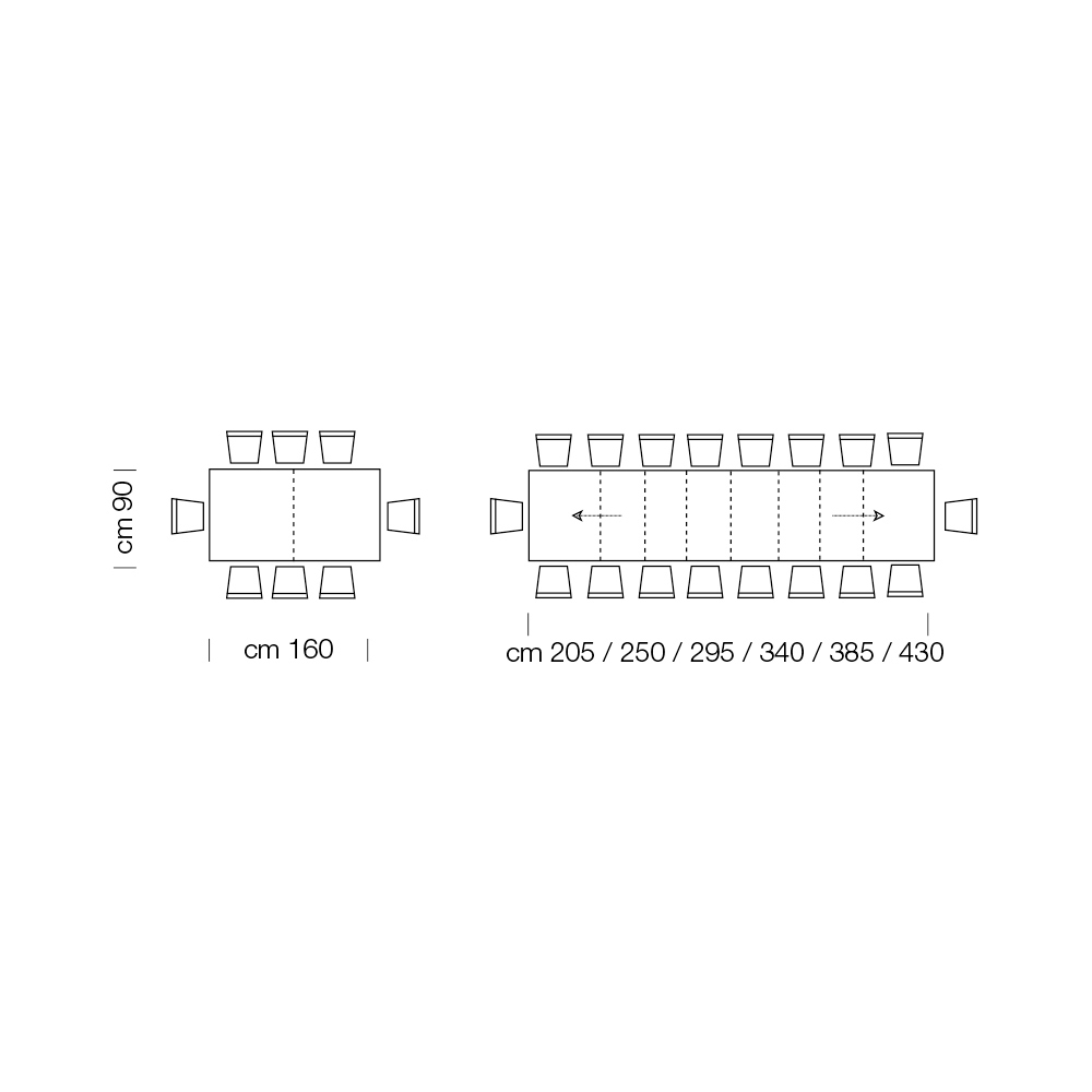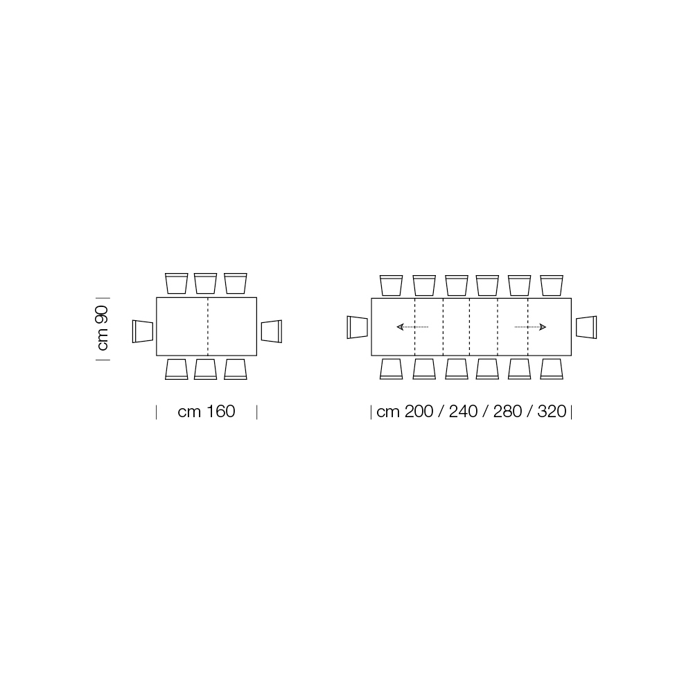 - Dł. 160 (430) x gł. 90 x wys. 77 cm 18-osobowy z możliwością przedłużenia za pomocą sześciu przedłużeń 45 cm, trzech wewnętrznych i trzech dostarczanych w kartonie wielokrotnego użytku;