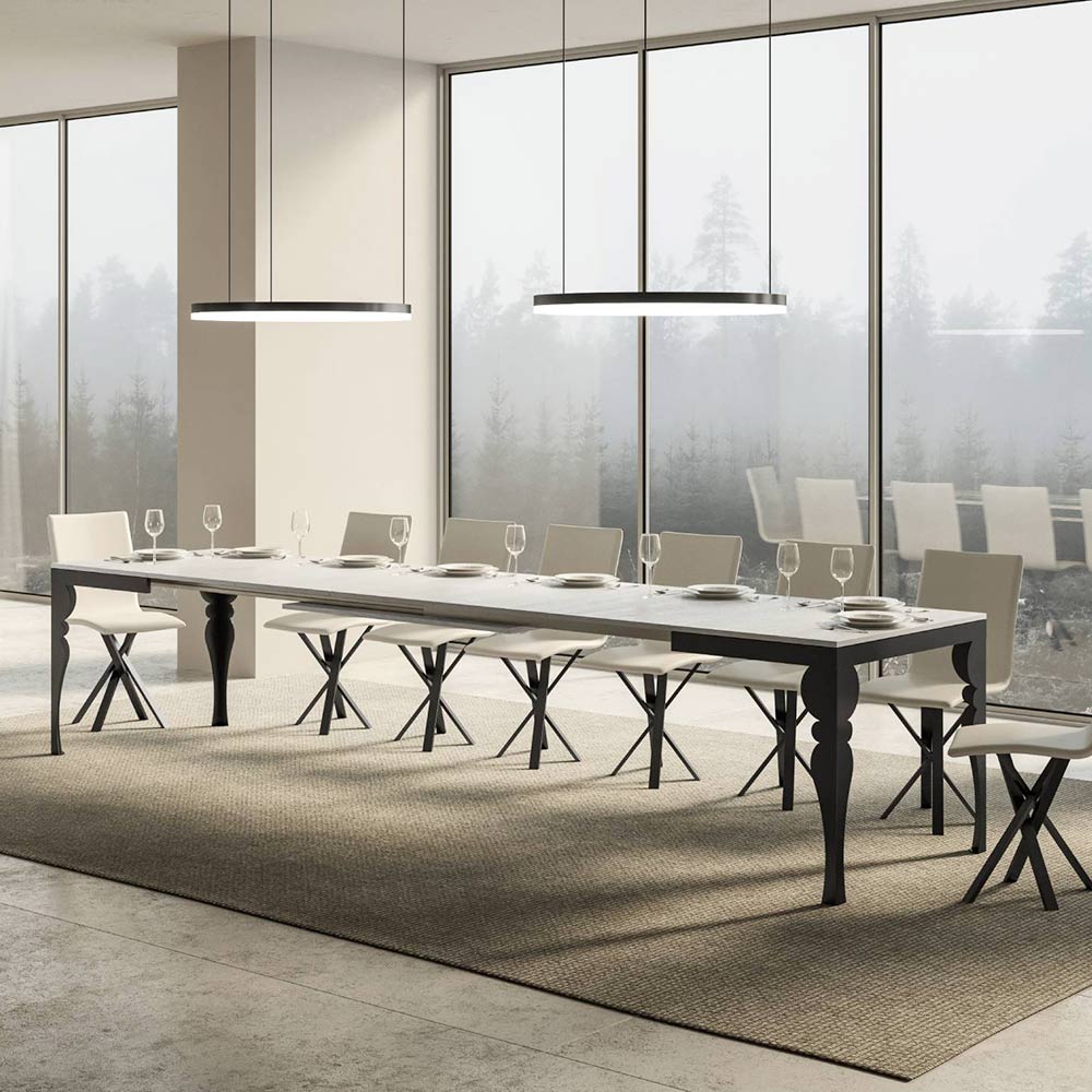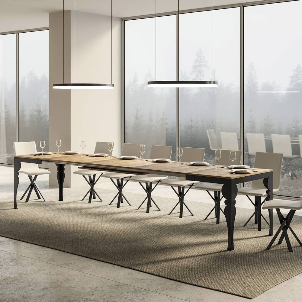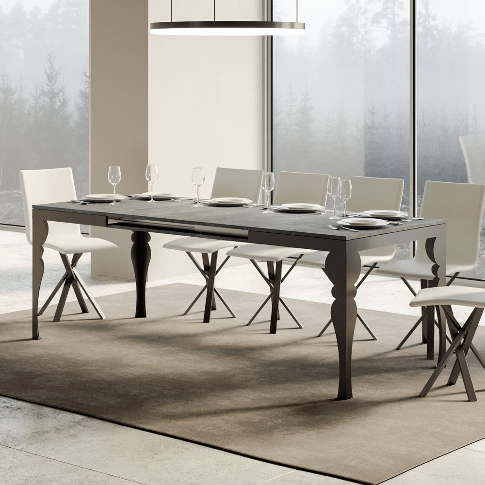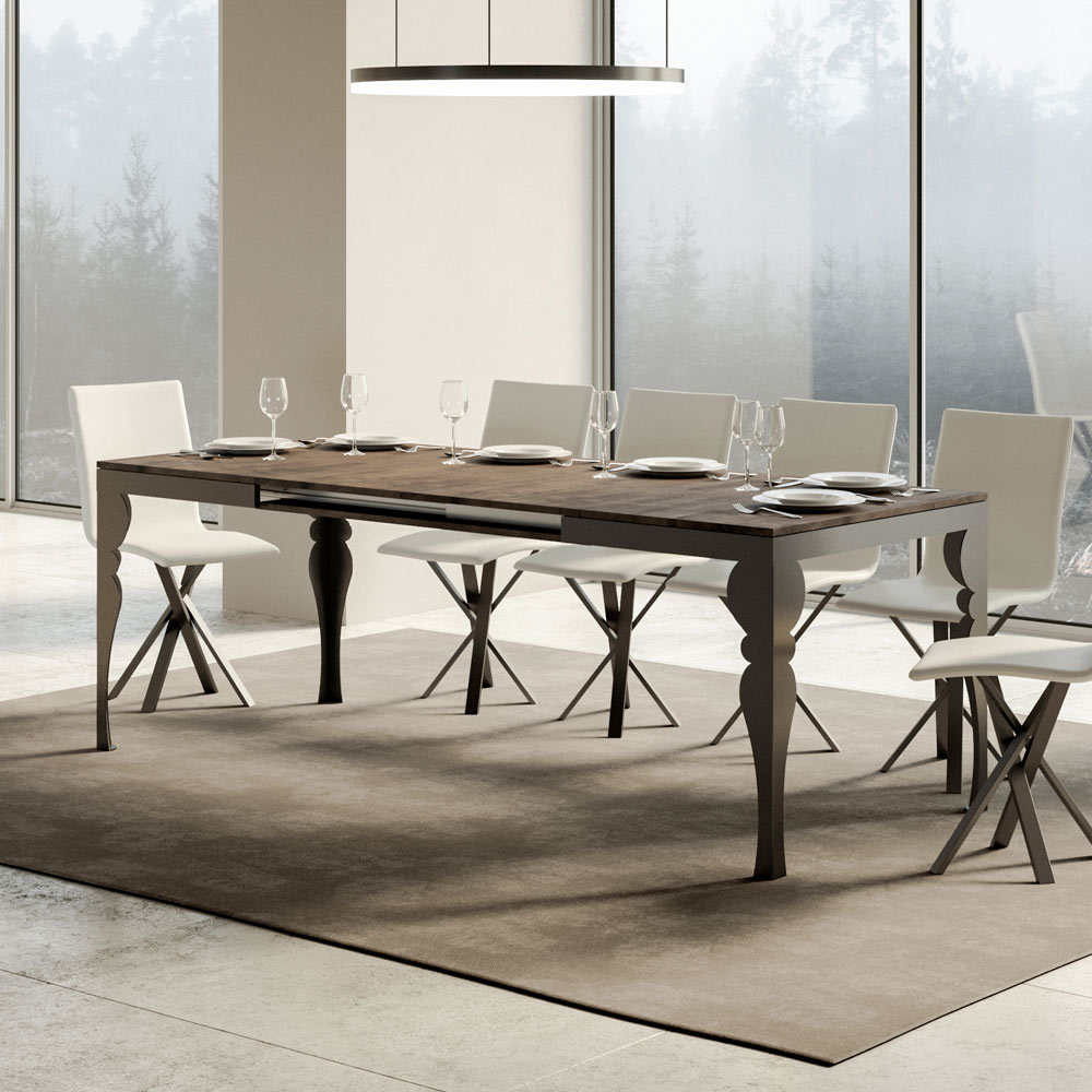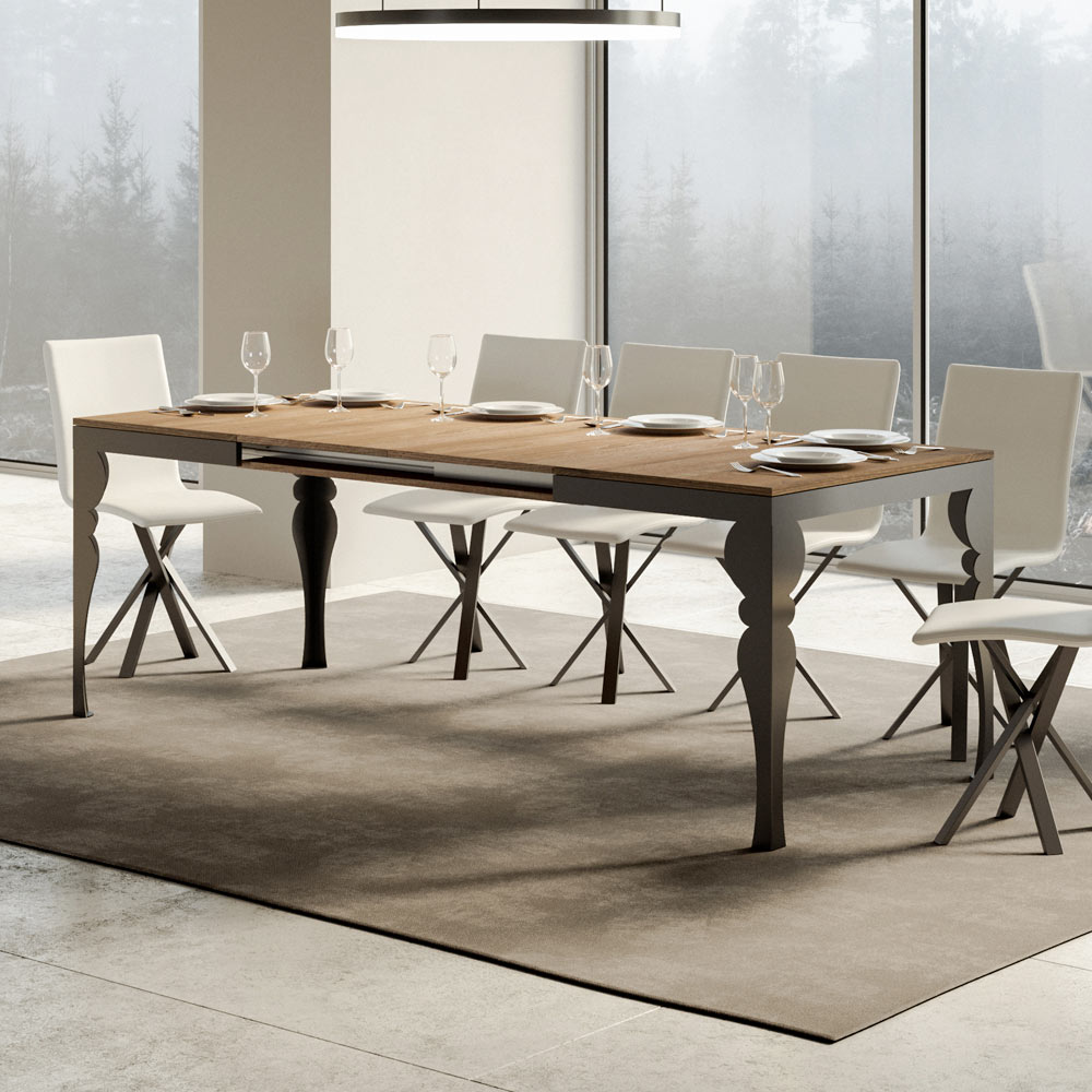 Ten rozkładany stół jest okazem wykwintnego rzemiosła, w którym tradycyjny design spotyka się z nowoczesną funkcjonalnością. Dzięki toczonym nogom w eleganckim antracytowym kolorze, stół ten przywołuje klasyczny styl, ale z odrobiną nowoczesnego wyrafinowania dzięki drewnianemu blatowi.