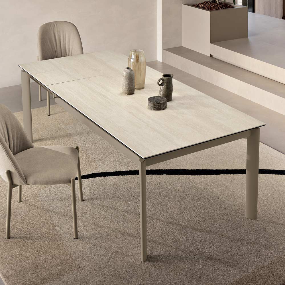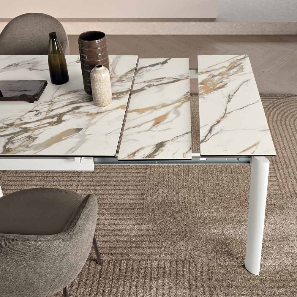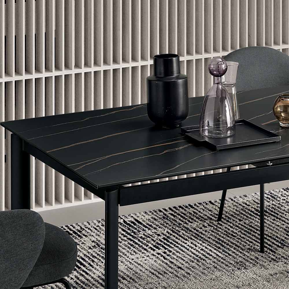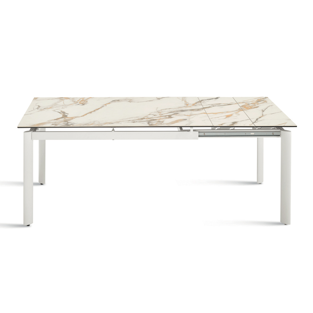 Elegancki, rozkładany stół o minimalistycznym designie, idealny do dodania stylowego akcentu do jadalni lub salonu . Malowana metalowa rama podtrzymuje elegancki blat z gresu porcelanowego imitującego marmur , zaprojektowany z myślą o praktycznym i wszechstronnym codziennym użytkowaniu.