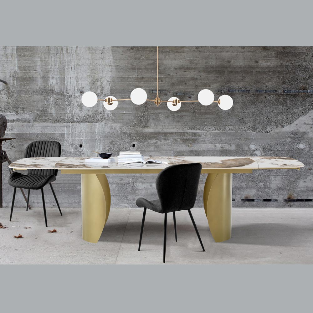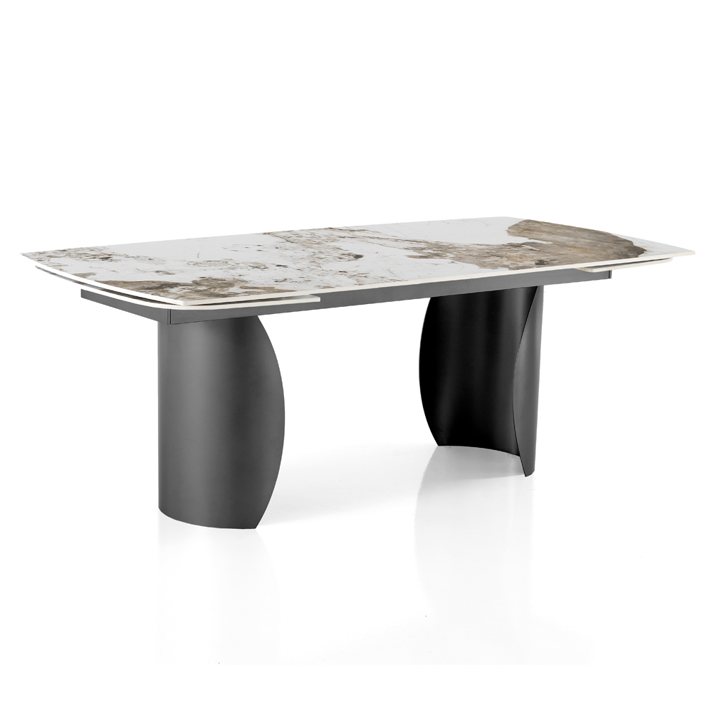 Ten rozkładany stół jest wysublimowanym wyrazem luksusu i funkcjonalności . Ceramiczny blat z efektem marmuru, charakteryzujący się misternymi, wielobarwnymi żyłkami, spoczywa na podwójnej podstawie, która nie tylko zapewnia stabilność, ale dodaje odrobinę wyrafinowanej elegancji .
