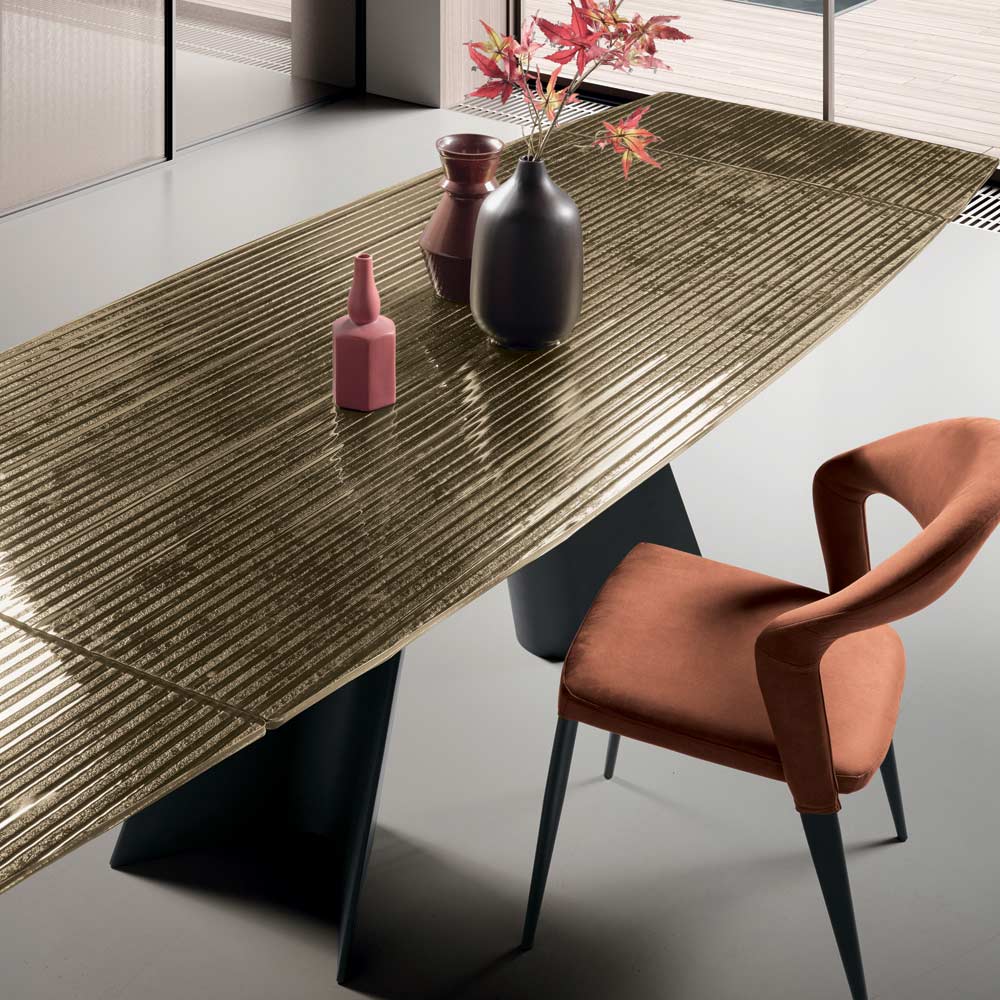 Wyrafinowany, designerski stół jadalny Made in Italy, zaprojektowany z myślą o eleganckim dopełnieniu wystroju jadalni lub salonu . Stół wyróżnia się srebrzonym, żebrowanym szklanym blatem – lśniącym materiałem, który odbija światło, tworząc sugestywne efekty wizualne i nadając pomieszczeniu wyrafinowany wygląd.